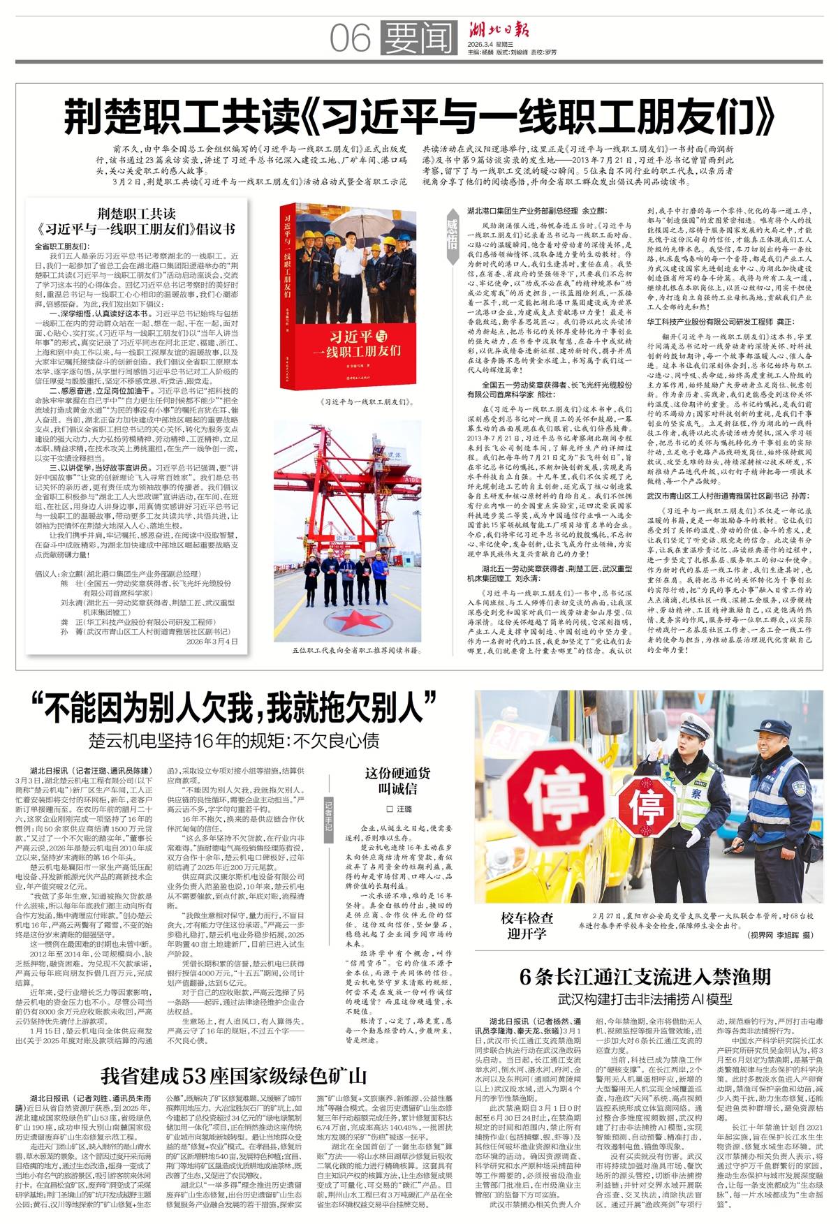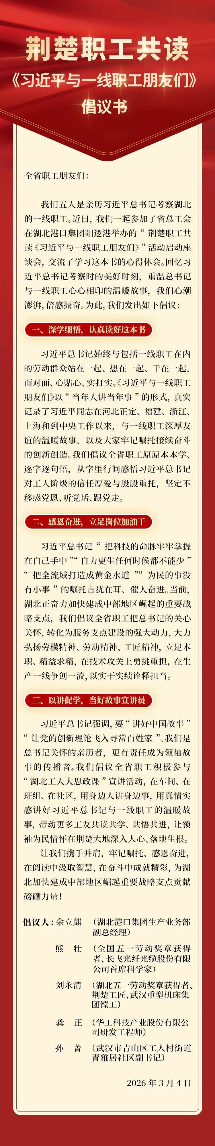 湖北日报讯(记者金凌云、通讯员黎甜)3月4日,湖北日报刊登一份由5名职工代表发出的倡议书,号召全省职工共同研读书籍《习近平与一线职工朋友们》。