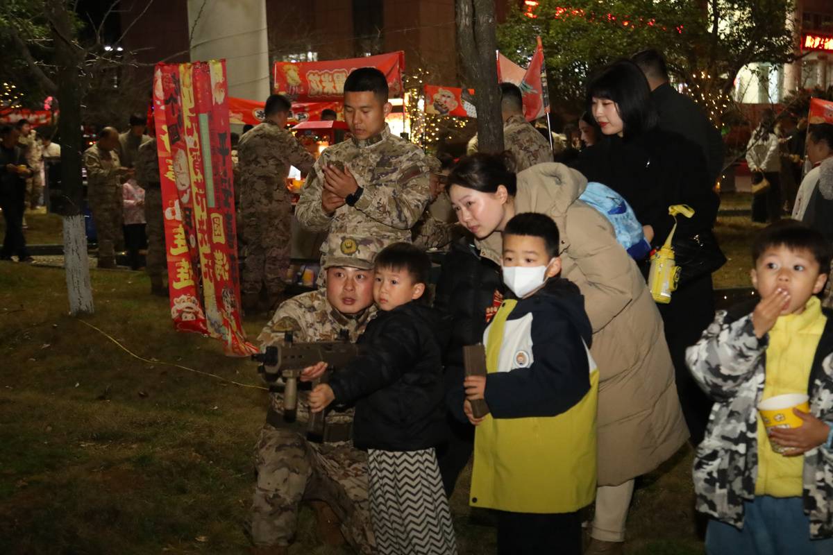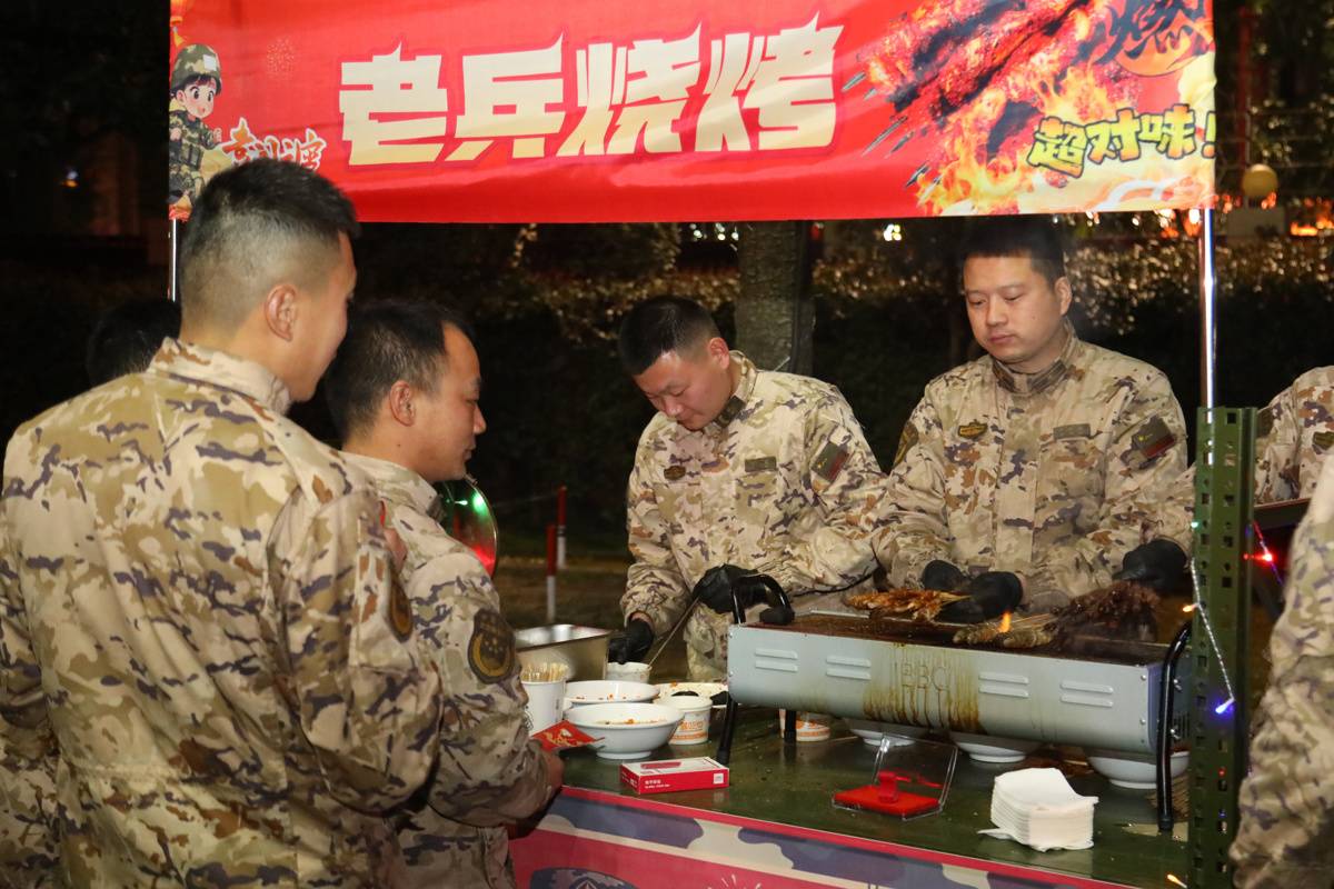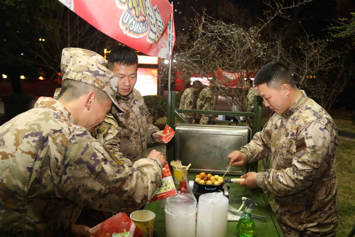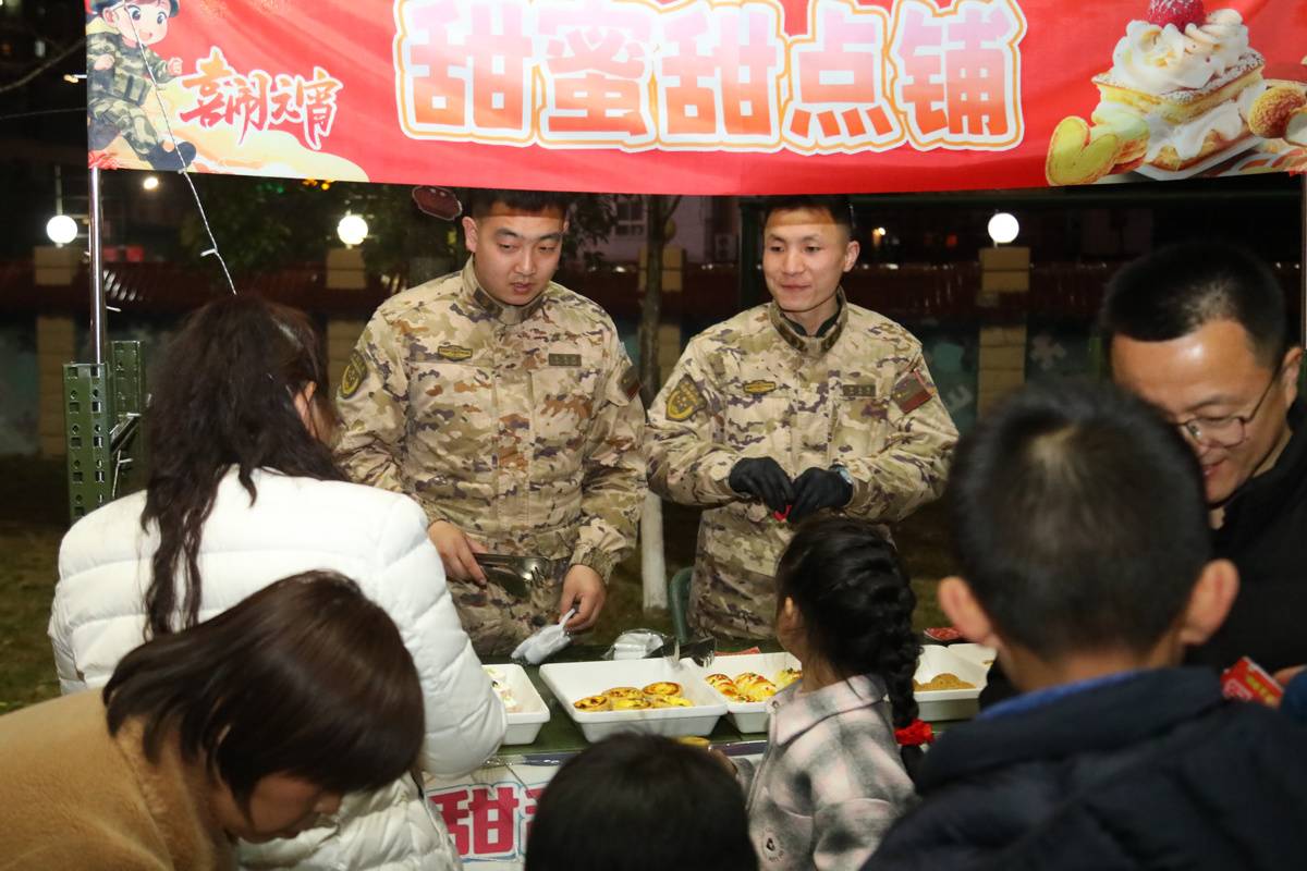 沿着游园路线,军营小吃街热闹非凡,幸福滚滚来汤圆、红红火火烤肠、开心爆米花、老兵烧烤、团团圆圆章鱼小丸子、蜜雪“兵”城饮品等十余种特色小吃依次排开,香气四溢。官兵及家属们手持积攒的军功券,免费兑换心仪的美食,舌尖上的美味不仅满足了味蕾,更让军营的元宵佳节充满了温暖的烟火气。
