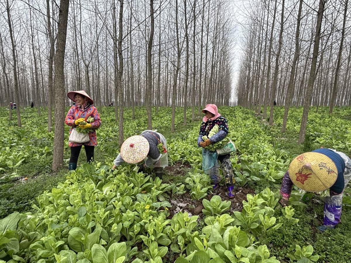 意杨林下,村民在收割菜薹。(湖北日报记者全媒记者彭磊 通讯员车荣华 摄)