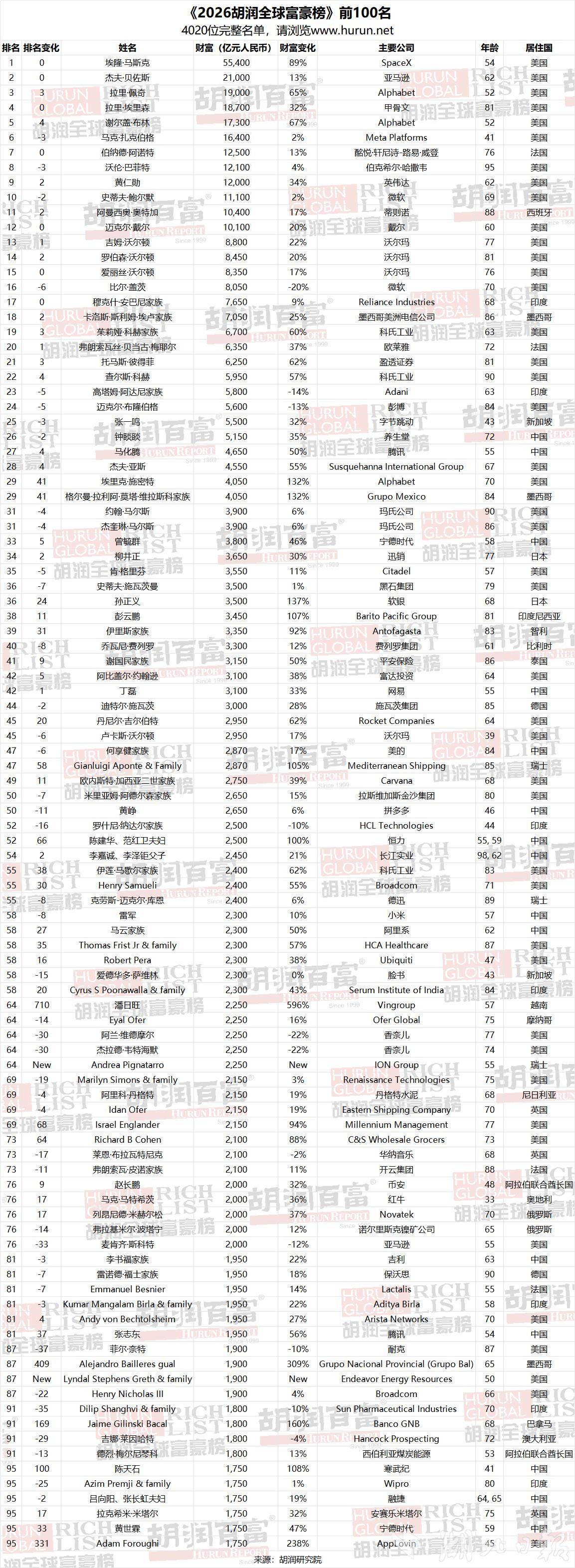 本次榜单中,中国以1110位十亿美元企业家重回全球第一,较去年增加287位;美国以1000位位居次席,增加130位。印度排名第三,拥有308位身家十亿美元的企业家。54岁的埃隆・马斯克凭借SpaceX和特斯拉的价值飙升,六年内第五次成为世界首富,财富达5.5万亿元人民币,增长89%。杰夫・贝佐斯、拉里・佩奇分列二三位。
