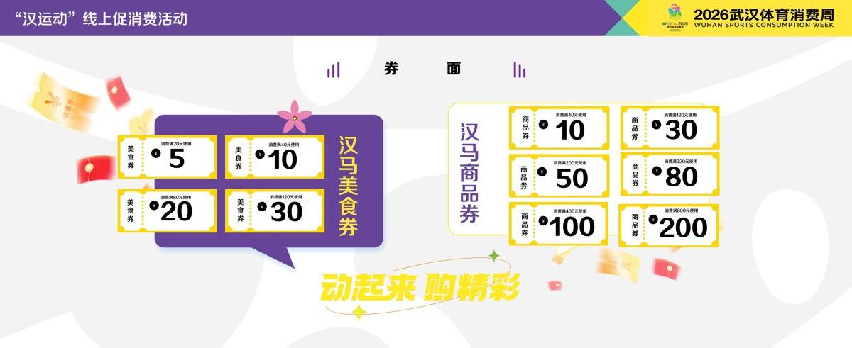 汉马商品券设10元至200元6种券面,可用于2026武汉体育消费博览会现场定点商户、大型商圈定点商户线下核销及“汉运动工场”微信小程序线上核销。同时,延续汉马选手特别福利,为所有2026汉马参赛选手额外定向发放50元专属汉马商品券。