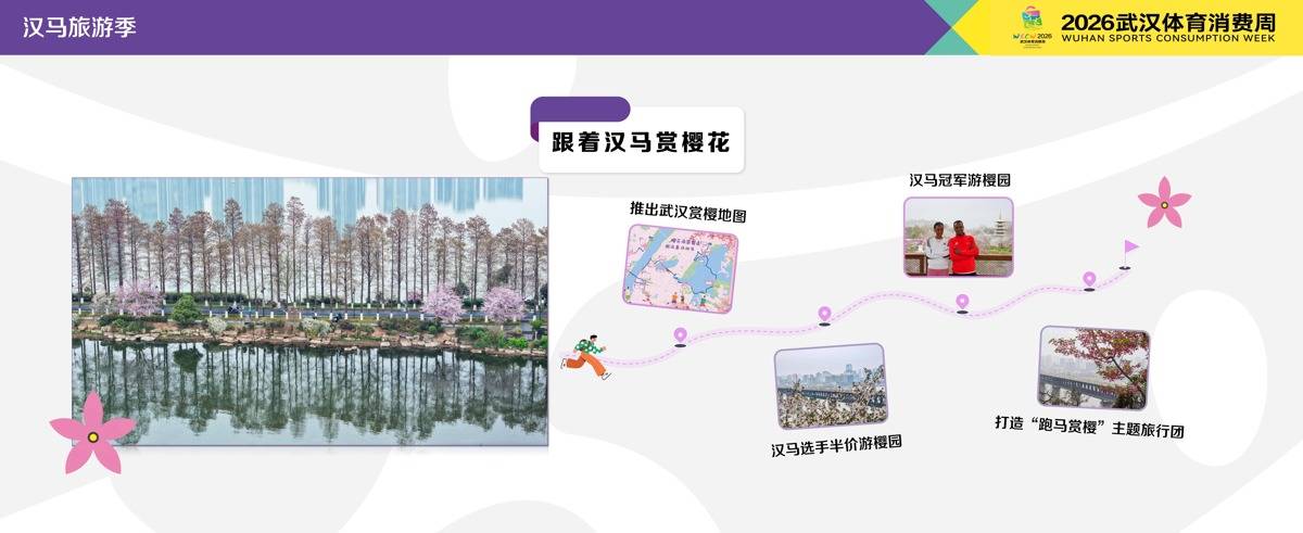 2026武汉体育消费周以樱花为媒,将推出“汉马旅游季”“汉马美食生活荟”“汉马嘉年华”系列活动,让参赛选手及市民游客可以放心地“跟着汉马赏樱花、游江城、品美食、逛商圈”,将赛事与城市文旅、消费深度融合,让跑者在参赛之余,全方位体验武汉的春日之美与烟火气息。
