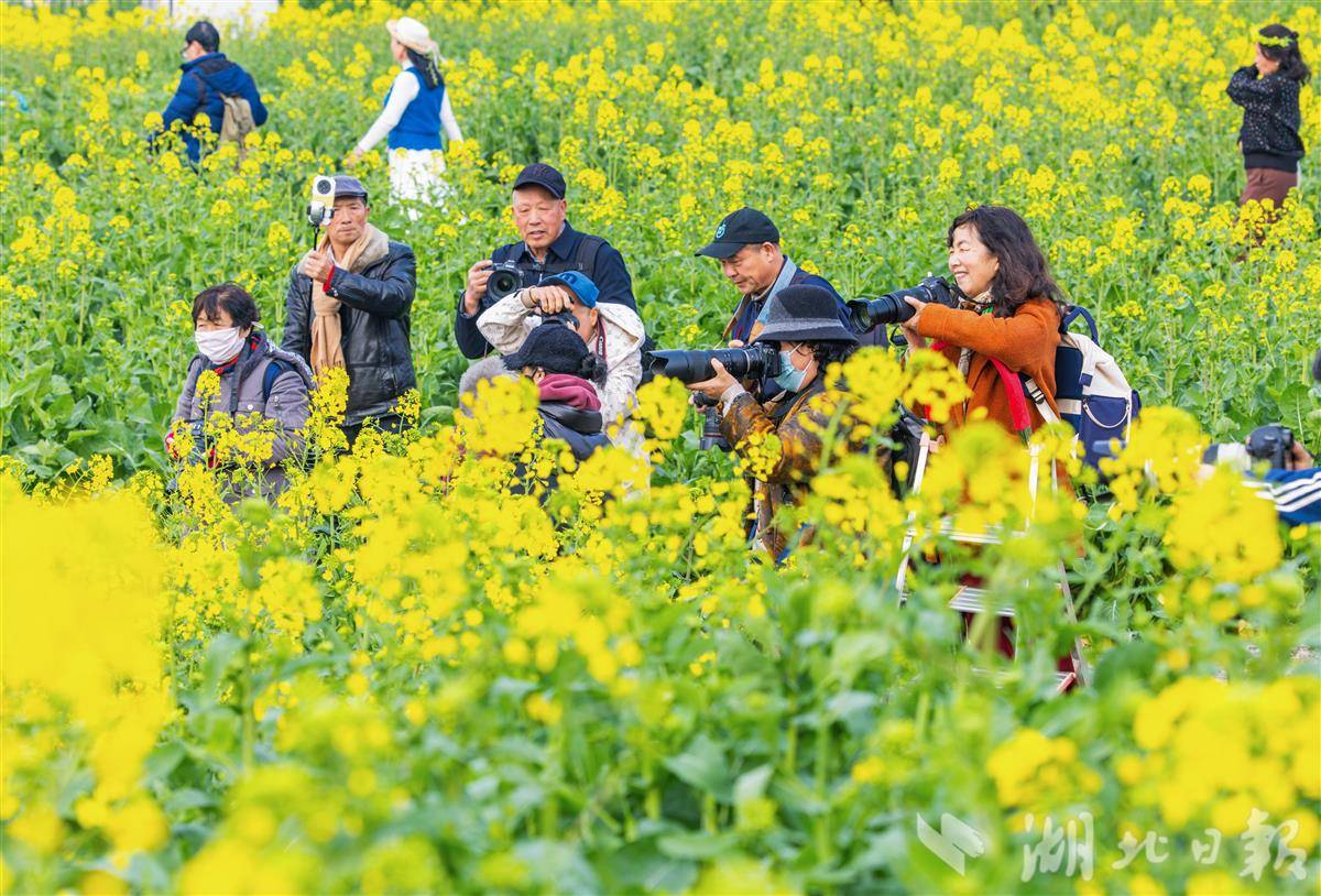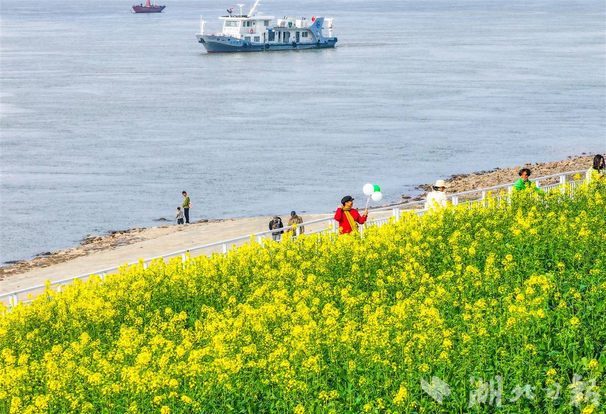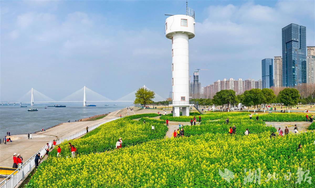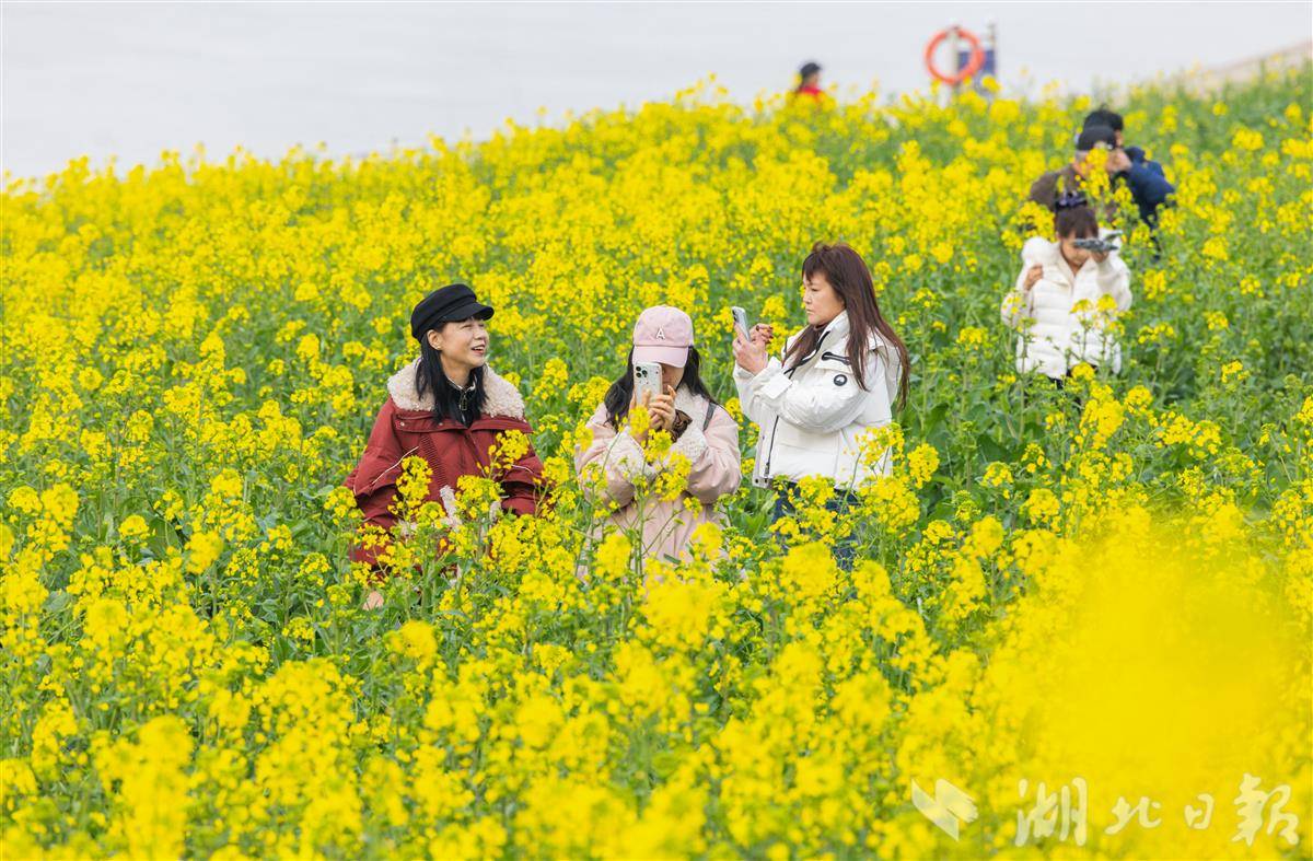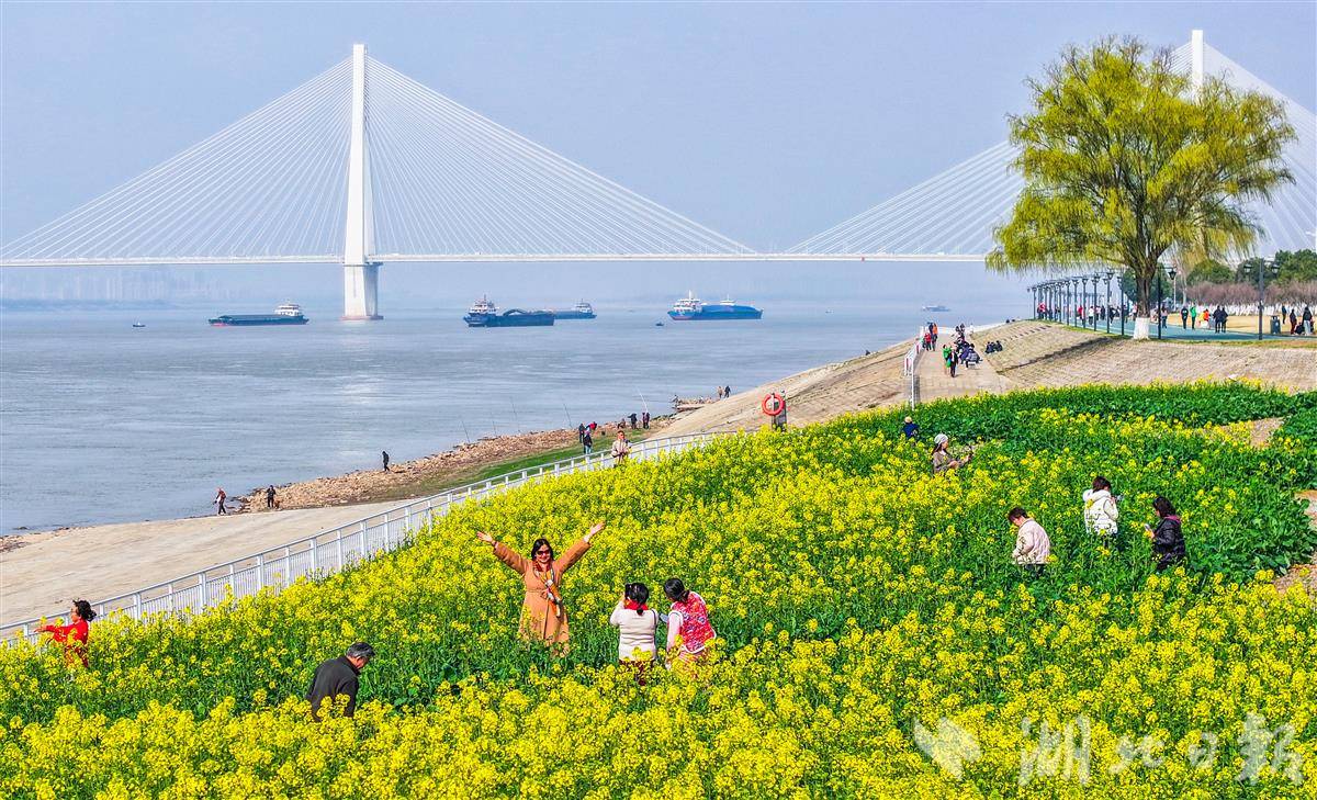 3月5日,武汉武昌江滩公园,连片的油菜花盛放,吸引众多市民和游客打卡、游玩。长江、大桥、游人和金色花海相映成趣构成一幅生机盎然的长江生态美景画卷。(湖北日报全媒记者 薛婷 摄)