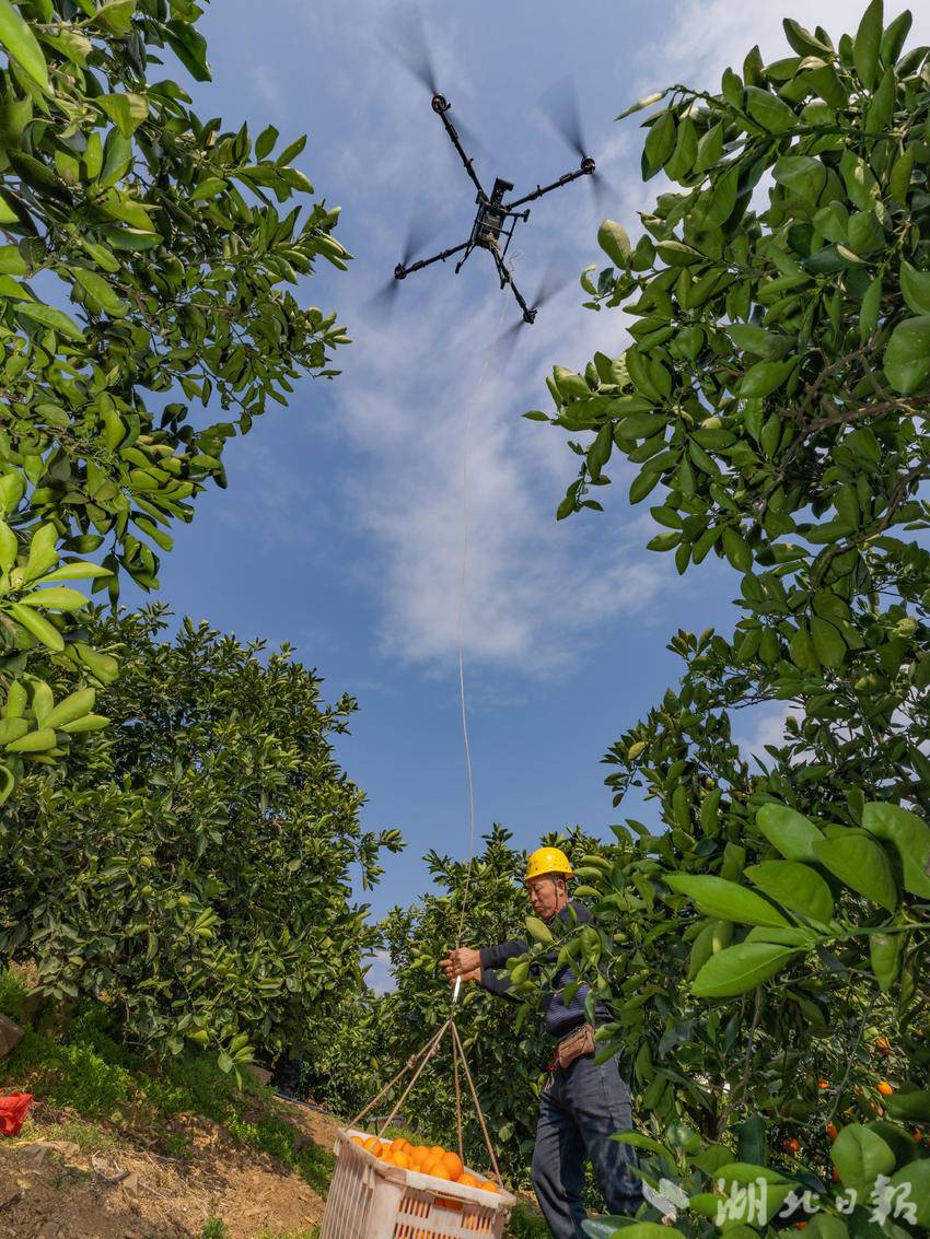 在郭家坝镇邓家坡村,果农正在利用无人机转运脐橙。彭强摄