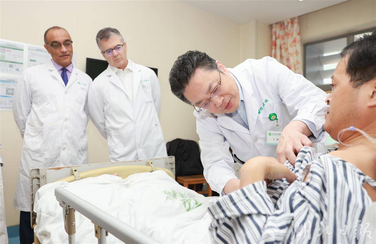 克利夫兰医学中心专家在同济医院病房观摩魏翔教授(右二)为患者查房。(通讯员 陆安迪 齐剑东 摄)