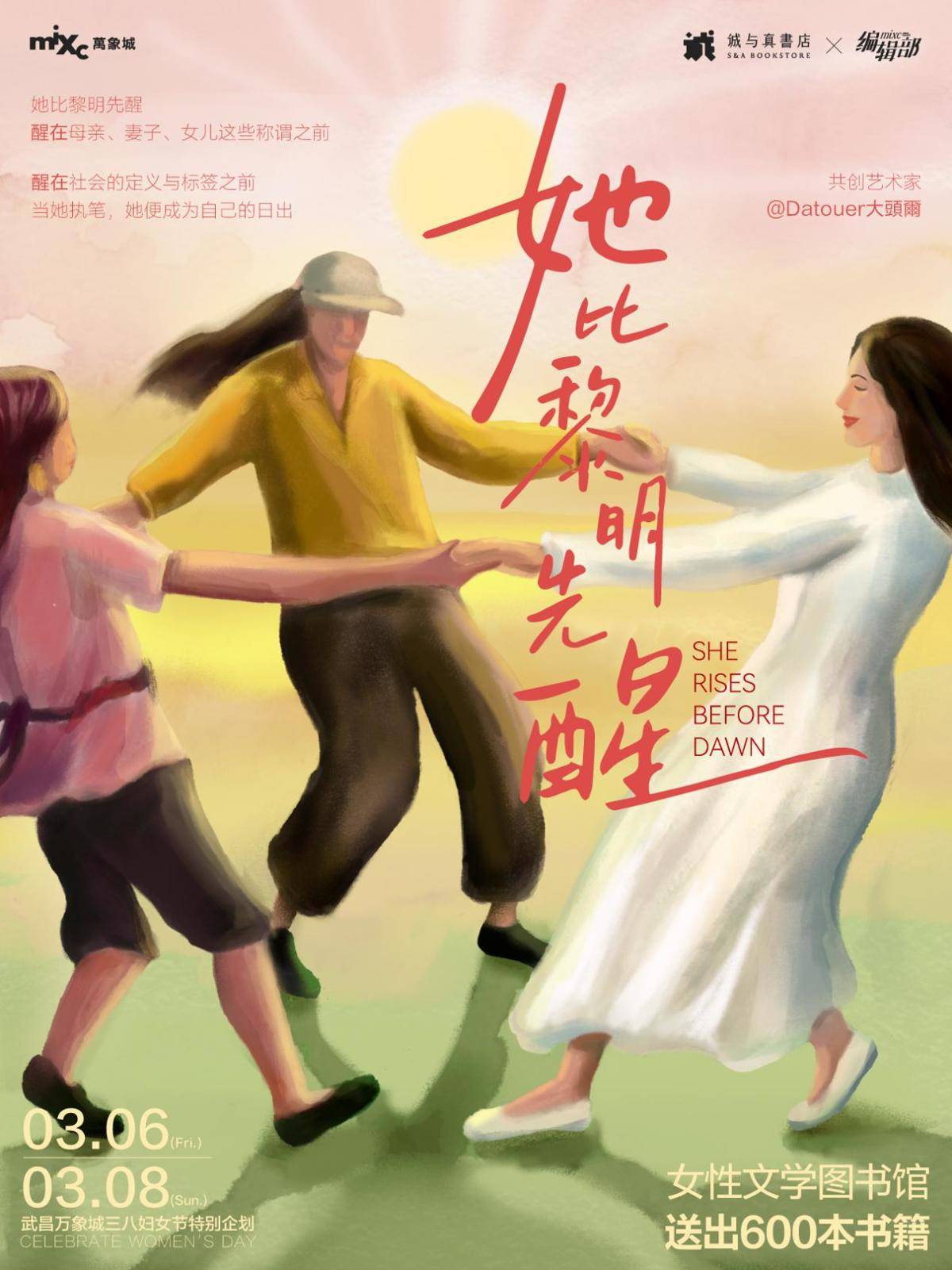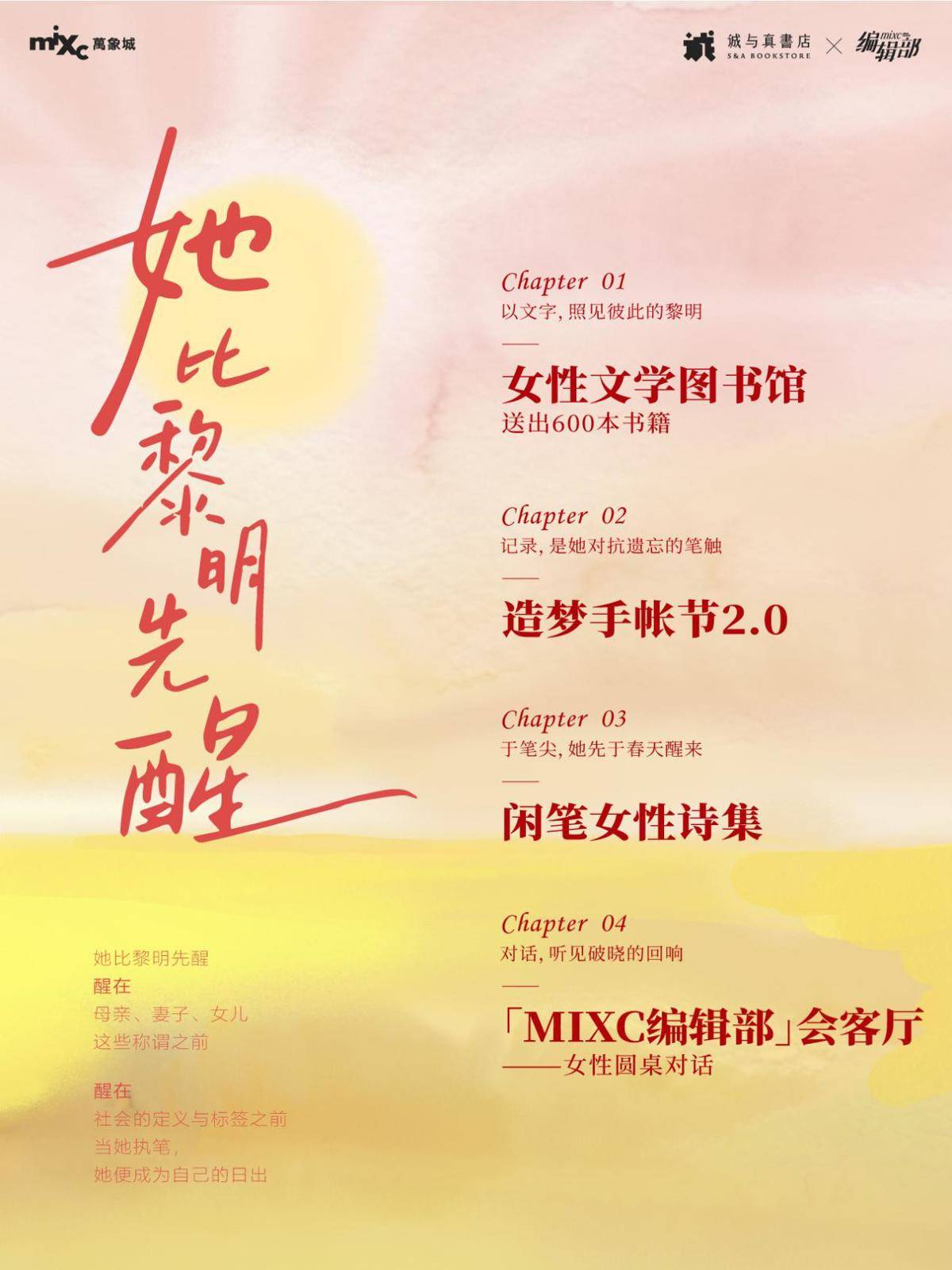 3月6日至3月8日,武昌万象城MIXC编辑部联合诚与真书店,以“她比黎明先醒”为主题,推出系列三八节特别企划,通过文字、笔迹、色彩与对话,探寻女性丰饶的内心世界,为即将到来的国际妇女节献上一场富有深度的文化盛宴。