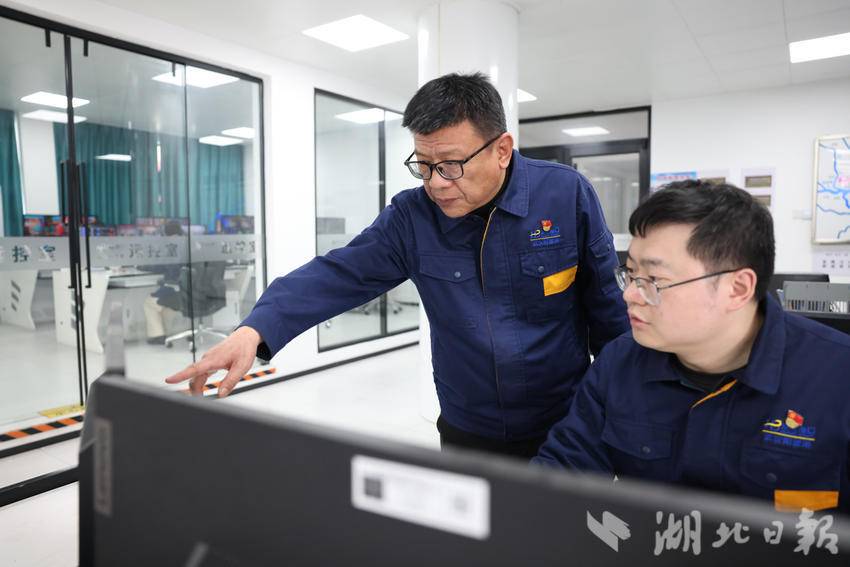 武汉港集装箱有限公司营运操作部经理黄伟(左)。(湖北日报全媒记者 柯皓 摄)