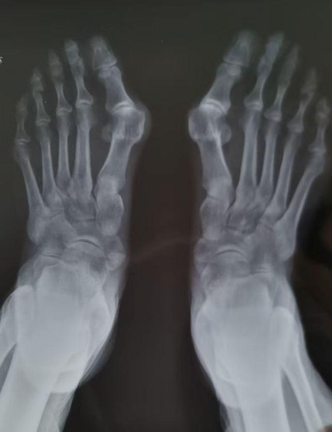 退休后,秦阿姨终于下定决心解决这个困扰多年的“足疾”。通过多方了解,她得知目前已有更先进的微创手术方式,于是来到武汉大学泰康临床学院、泰康同济(武汉)医院就诊。经过详细检查和评估,泰康同济(武汉)医院骨科团队为其量身定制了手术方案——采用目前较先进的微创术式,行双侧第一跖骨截骨术+骨髓内针内固定术。手术过程中,医生依次完成骨赘切除、跖骨截骨、关节复位及spear plate髓内板固定,C臂透视显示固定复位效果理想。术后检查双拇趾活动度、稳定性及关节复位情况均良好。