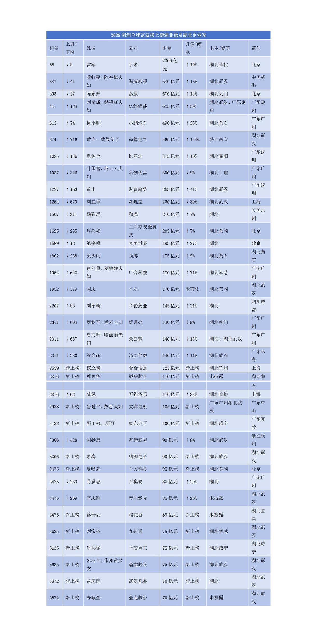 支点财经记者梳理榜单发现,30余位湖北籍及湖北企业家上榜。湖北仙桃人雷军,因创立了小米以2300亿元财富,再次位列湖北籍企业家榜首,财富相比上年升值10%,并在全球榜单中的排名为第58位。