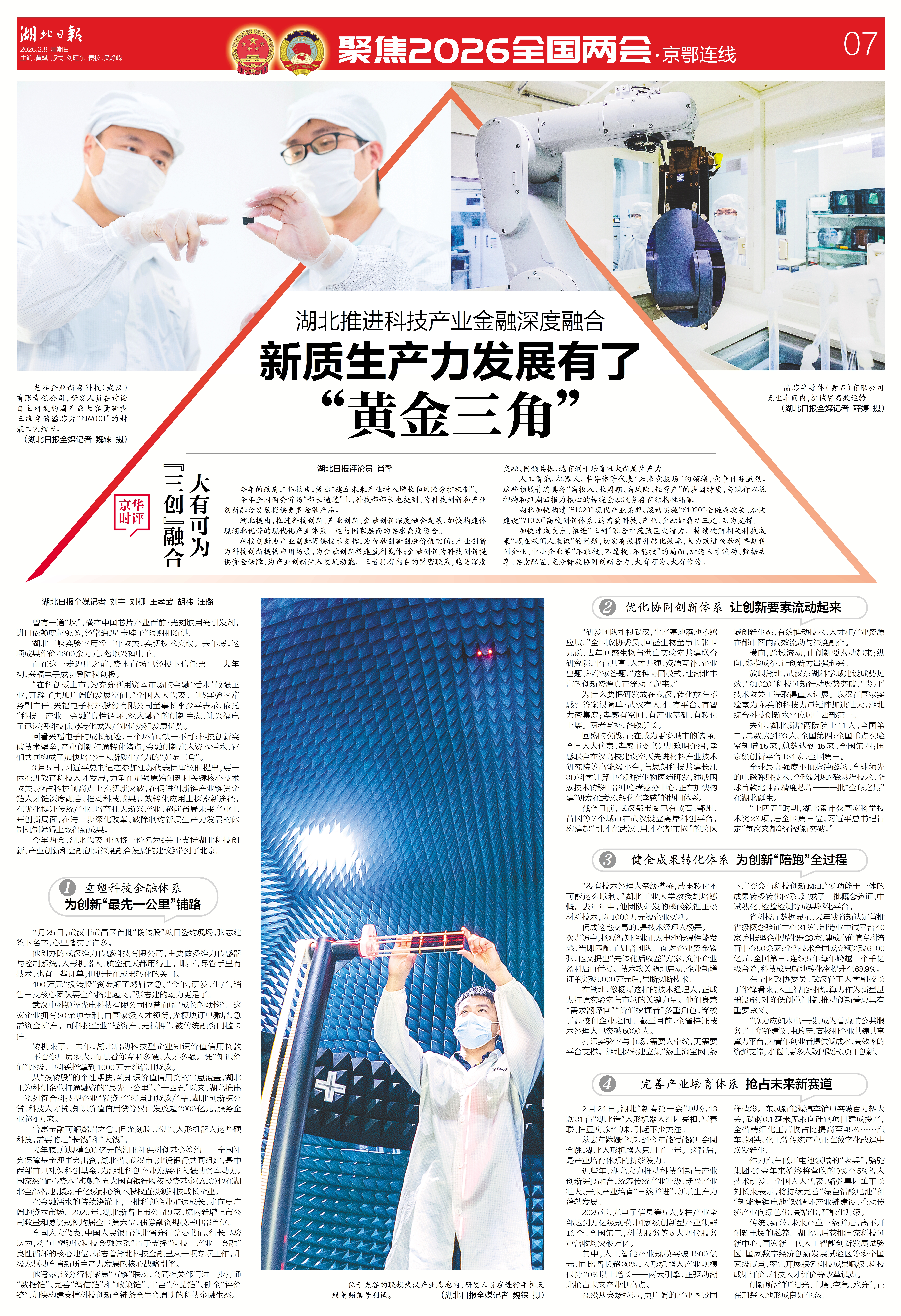 “大力推动科技创新、产业创新和金融创新深度融合发展,是贯彻落实习近平总书记考察湖北重要讲话精神的具体行动,是加快高水平科技自立自强、实现创新驱动引领高质量发展的内在要求,是加快建设现代化产业体系、巩固壮大实体经济根基的迫切需要,更是湖北塑造发展新动能、新优势,赢得未来竞争主动权的关键举措。”胡玖明说,在今年的湖北省政府工作报告中,也提出要大力推进科技创新、产业创新和金融创新深度融合发展,加快构建体现湖北优势的现代化产业体系。这传递出了湖北作为经济大省,在新起点上,从“单点突破”转向“系统重构”,从“全面普惠”转向“精准滴灌”,从“跟跑追赶”转向“创新突围”的强烈信号,必将加快构建湖北“科技——产业——金融”高水平循环生态,以金融“活水”浇灌创新沃土,以科技引擎驱动产业升级,形成推动新质生产力发展的“黄金三角”。