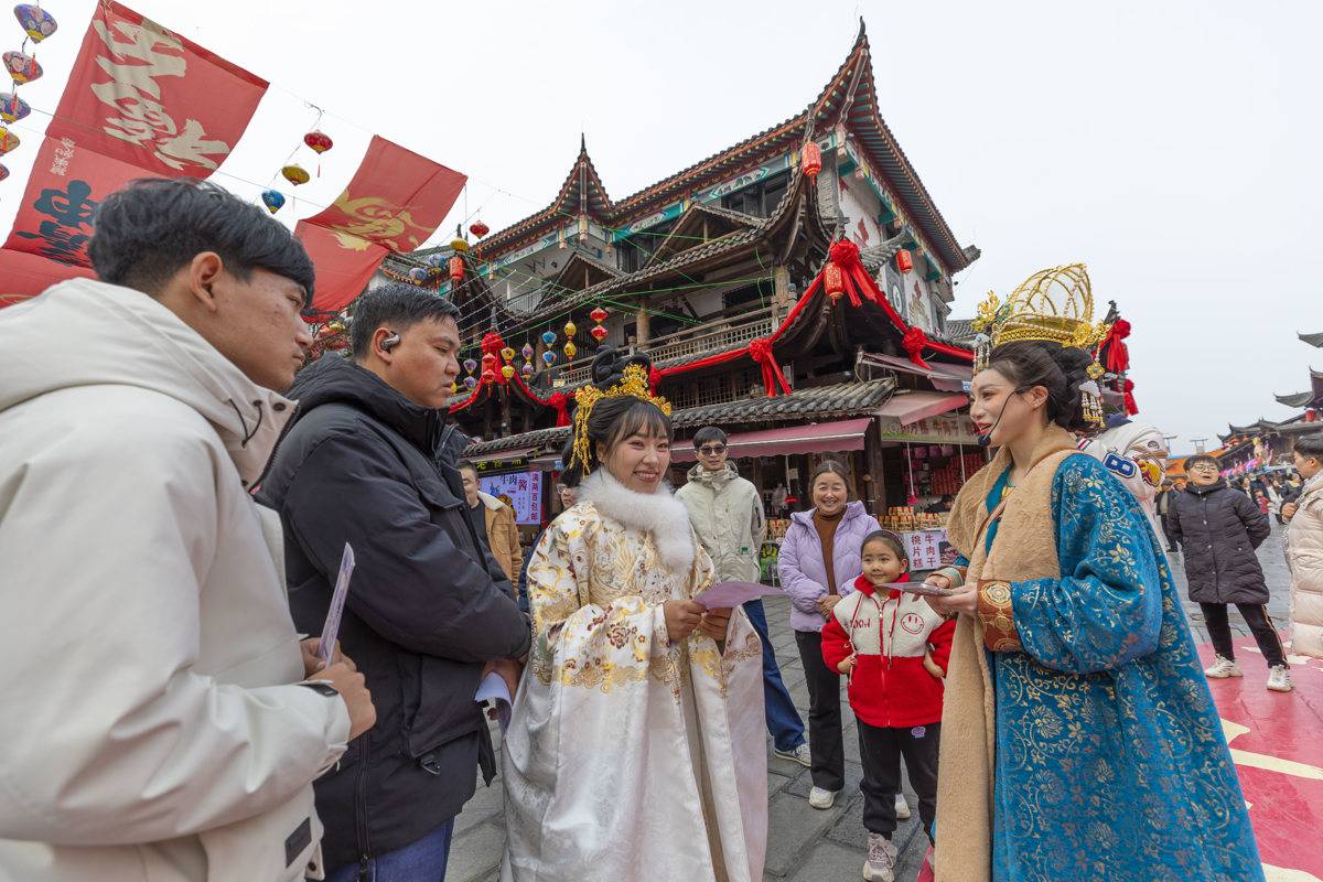 正月初八,春雨淅沥,部分游戏环节临时叫停,但无人值守的体验点位前依旧排起长队,工作人员只得紧急返岗。这份人气的背后,是非遗资源的创新活化与本土文化的深度融入。恩施市非遗中心主任谭骁介绍,所有NPC演员均从女儿城现有的非遗传承人中选拔。景区根据每位传承人的特长量身打造角色,并开展专项培训,让每个人都形成专属的个人IP。这些本土表演者深谙恩施的风土人情,能在互动中自然融入土家文化元素,让游客感受到最地道的地域特色。