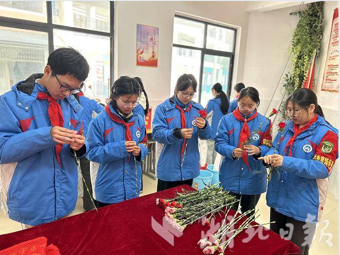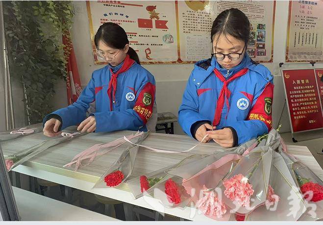 孩子们身着整齐的蓝校服,系着鲜艳的红领巾,在老师的指导下,认真地修剪花枝、搭配色彩、包装花束。他们稚嫩的双手,将一朵朵康乃馨细心包裹,每一片花瓣都承载着对女性长辈、老师的真挚祝福,每一个动作都透着对“她力量”的深深敬意。
