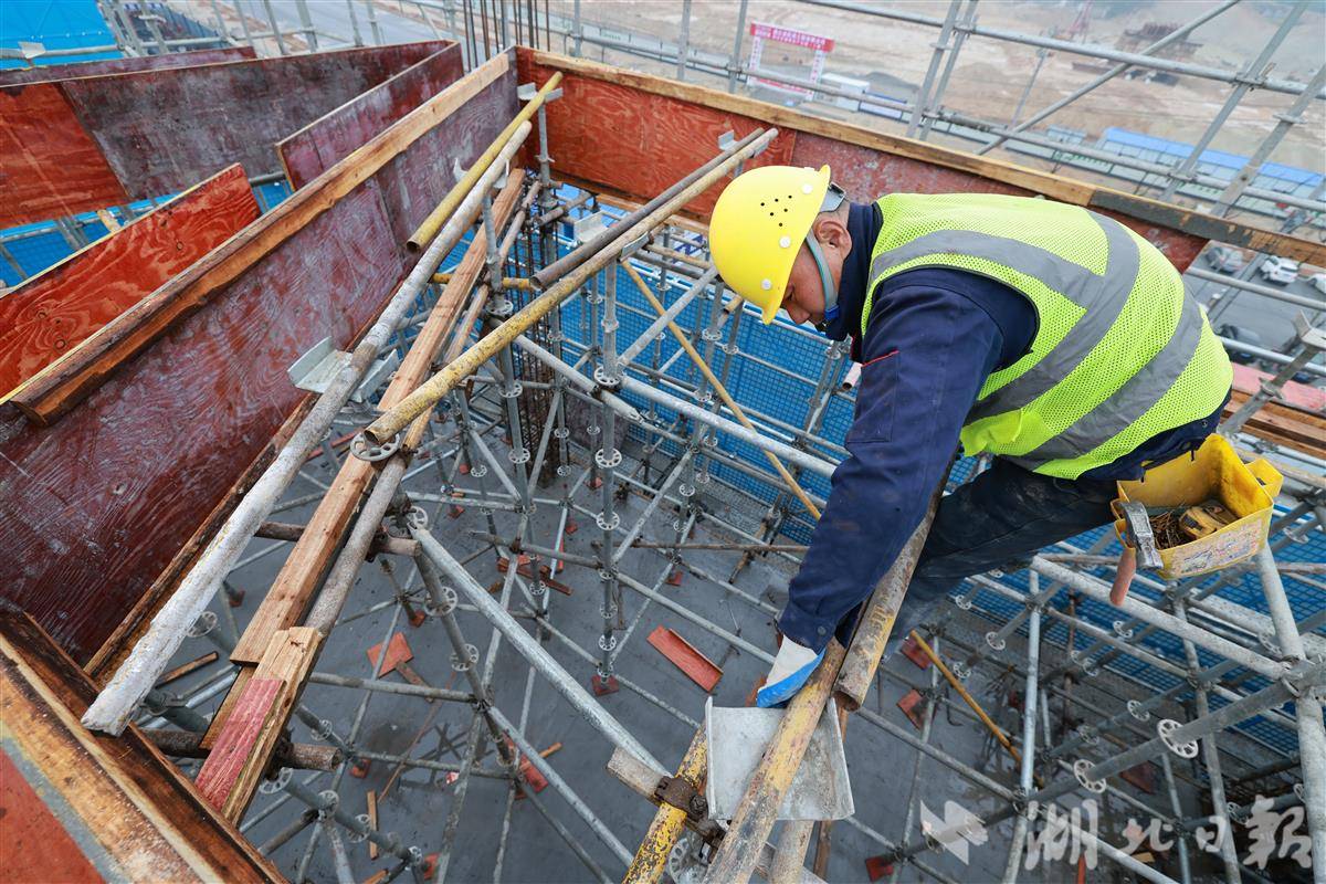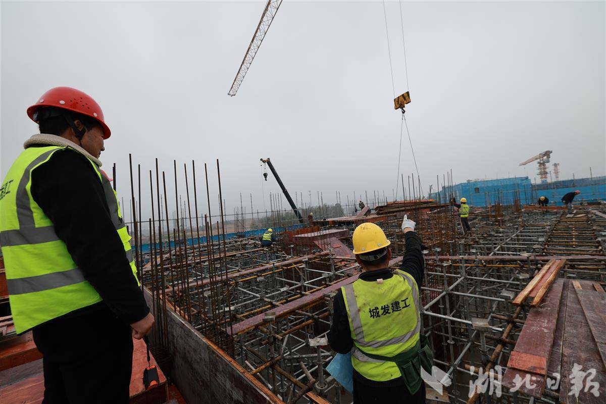 鄂湘赣商贸物流中心项目建设工地,工人在紧张施工。(湖北日报通讯员 黎赏 摄)
