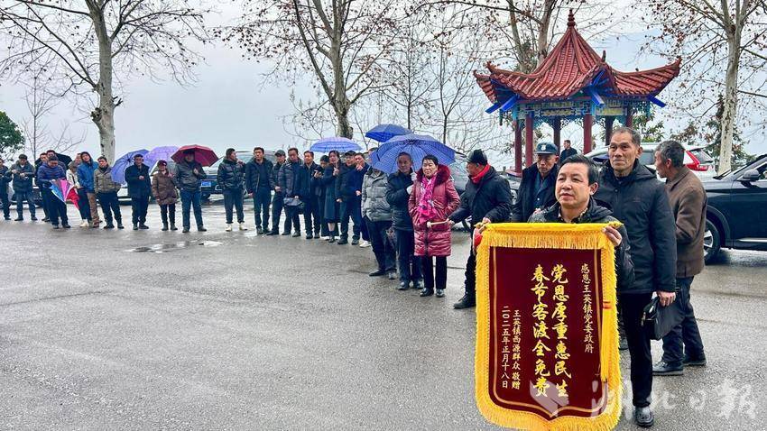 2025年2月20日,正月廿三,春雨润如酥。王英镇政府大院里,西源片五个村的50余名群众自发集结,敲锣打鼓,将一面写着“党恩厚重惠民生,春节客渡全免费”的锦旗郑重地送到镇党委书记孔祥鹏和镇长卢晓的手中。