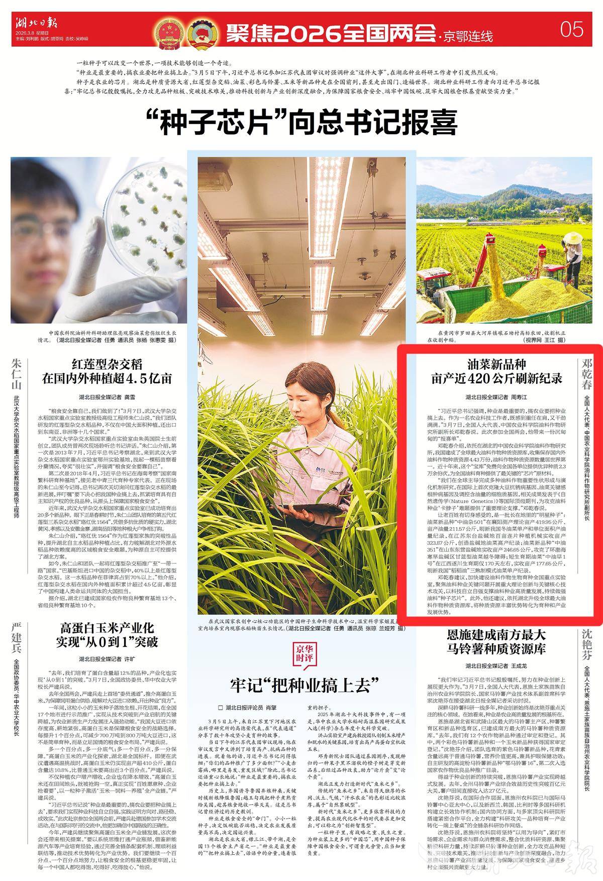 “习近平总书记强调,种业是最重要的,搞农业要把种业搞上去。作为一名农业科技工作者,既感到重任在肩,又干劲满满。”3月7日,全国人大代表、中国农业科学院油料作物研究所副所长邓乾春说。此次参加全国两会,他带来一份沉甸甸的“报喜单”。