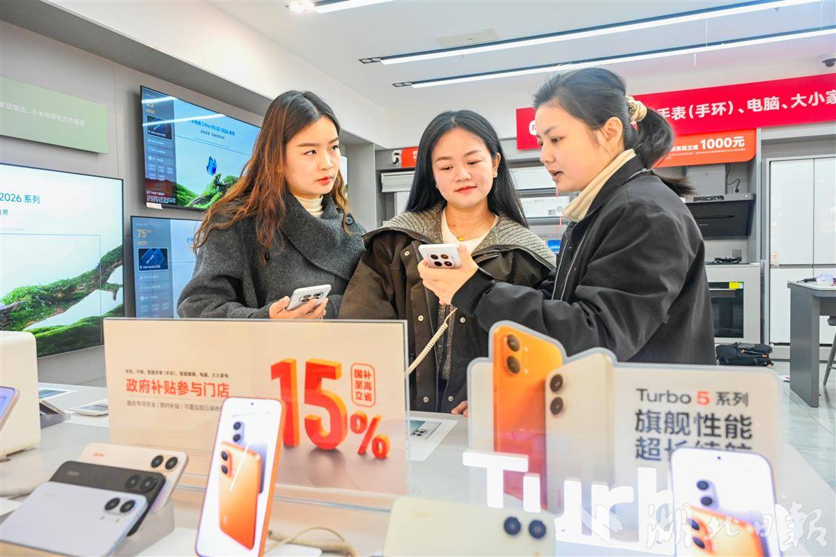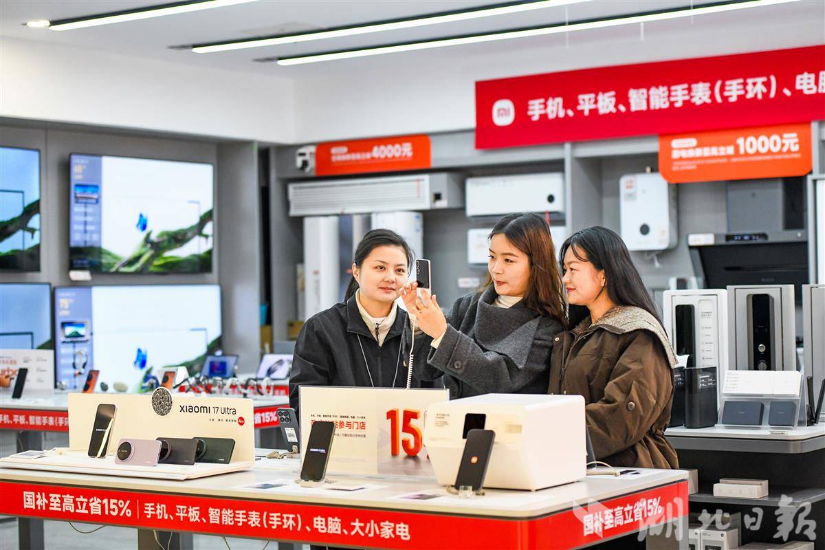 3月6日,黄冈市浠水县润达商场内,消费者正在选购手机。为落实新一轮以旧换新和国家补贴政策,当地政府与商家积极对接,对手机、平板、智能手表、电脑及大小家电等商品推出最高15%的国补优惠,政企协同发力有效激发了居民消费热情,带动数码家电市场持续回暖。(视界网 王江 摄)