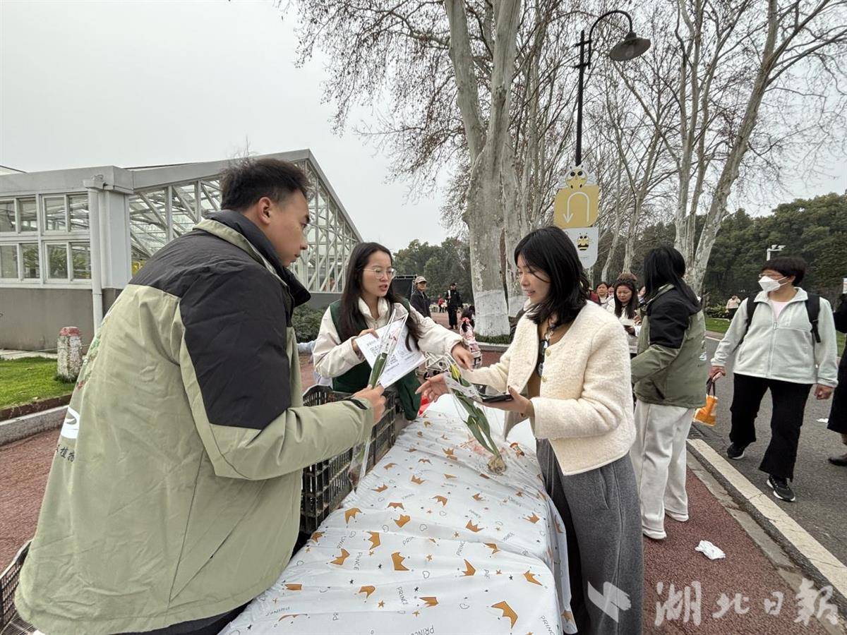 市民黄女士和朋友领到鲜花后便第一时间发了朋友圈:“排队排了十几米,没想到今天人这么多!”她购买的是女性专属套票,相当于原价对折,“既能赏花,又能享受到实实在在的优惠,园区太有心了。”目前,武汉植物园内温室热带兰、玉兰花、郁金香等都正值观赏期,园内人头攒动。