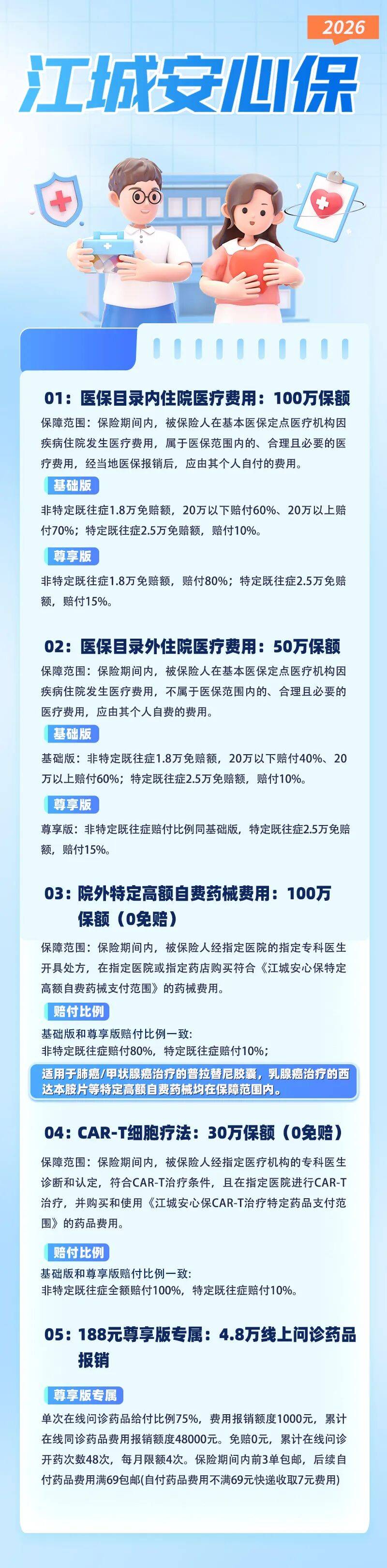 “江城安心保2026” 实现了从医保目录内疾病住院医疗费用到医保目录外疾病住院医疗费用,从住院医疗到院外特药的全方位覆盖。特别是CAR-T疗法0免赔、院外高额自费药品0免赔的保障设计,切实减轻了重大疾病患者的用药负担。