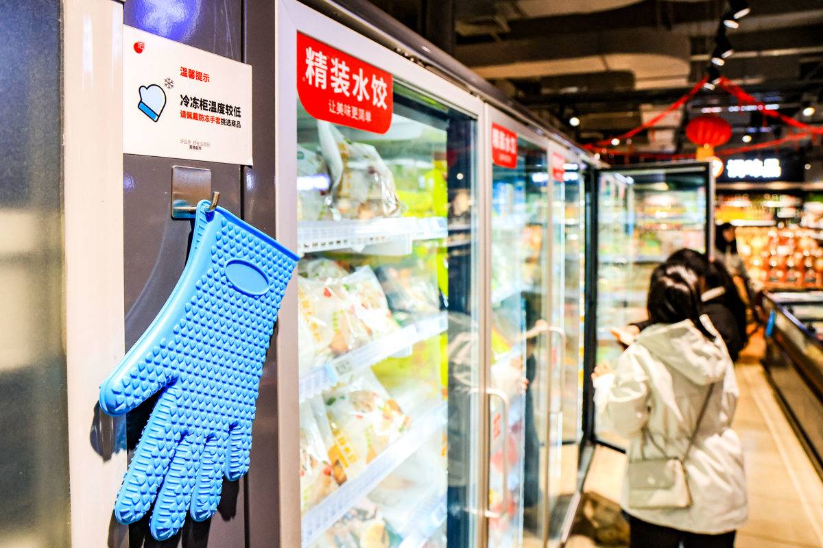 2026年1-2月,黄冈新春消费市场“热力全开”,汽车、家电、数码、餐饮、住宿等市场持续火爆。图为3月3日元宵节,黄商生活超市万达广场店,店方在冻柜旁贴心地设置了防冻手套,方便顾客拿取商品。(湖北日报全媒记者 成熔兴 摄)
