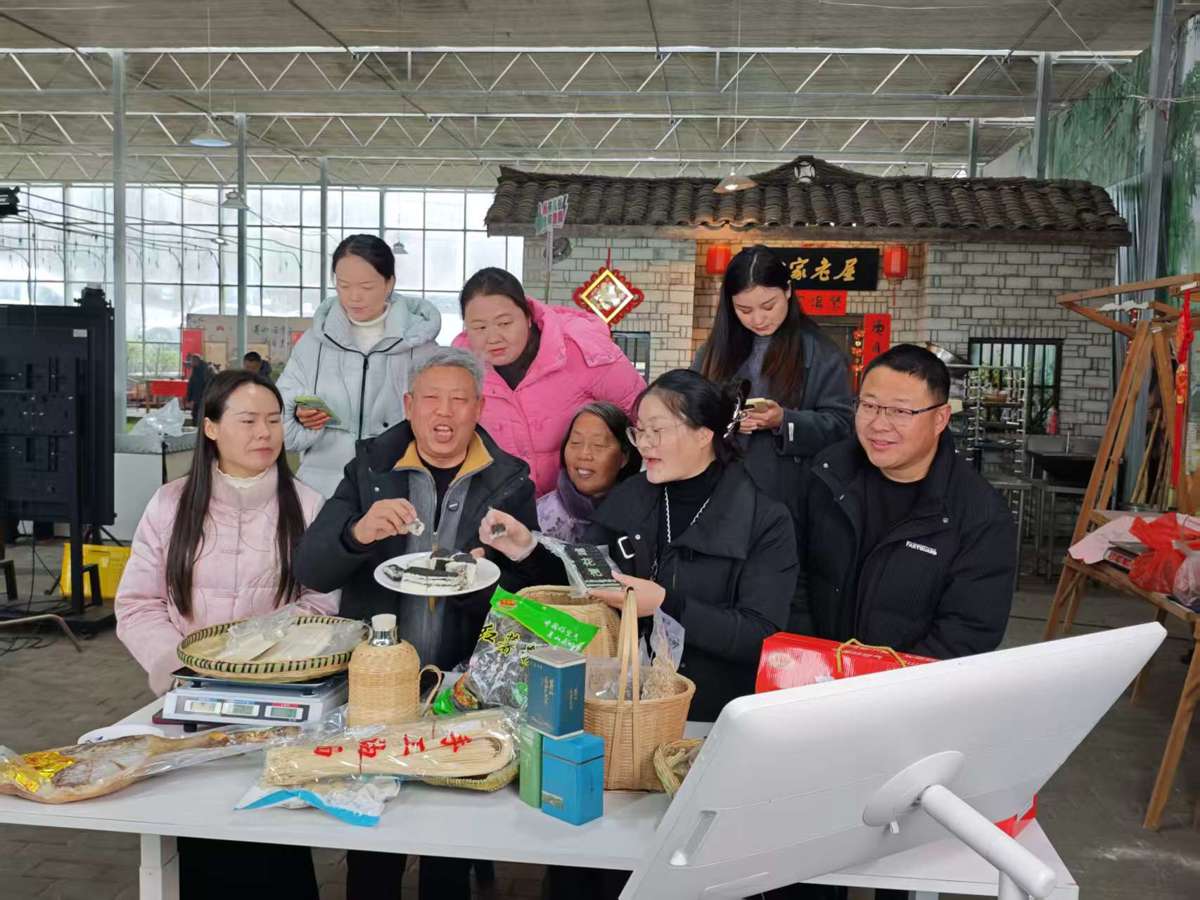 图为新春期间,黄冈罗田燕儿谷举办乡村云集市,大家直播出镜售卖大别山物产。(通讯员 陈钦 王满 摄)