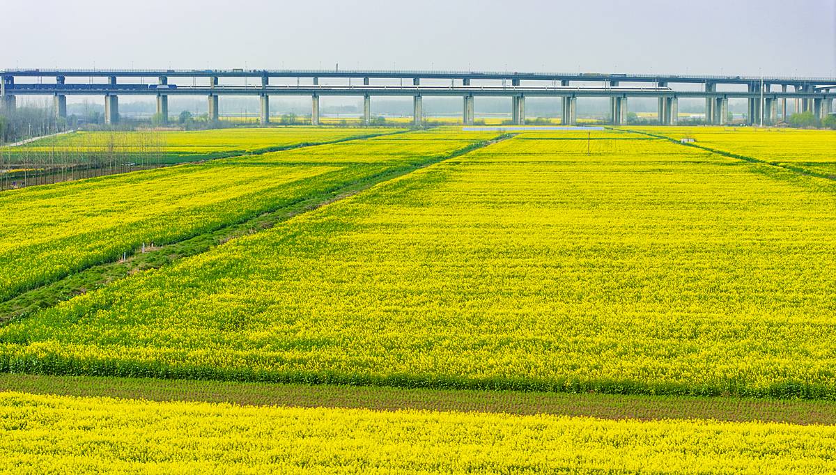 3月9日,鸟瞰武汉天兴洲油菜花海,只见5000余亩油菜花海在春风中摇曳生姿,与天兴洲公铁两用长江大桥形成了一幅美丽的画卷。车从“花”上穿过,江心绿洲入画来,成为该市可以免费采摘黎蒿并游玩的最佳打卡地。(湖北日报全媒记者 朱熙勇 摄)