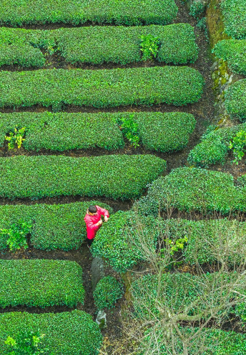 3月9日,茶农在湖北省秭归县茅坪镇中坝子村一茶园采摘茶叶嫩芽。