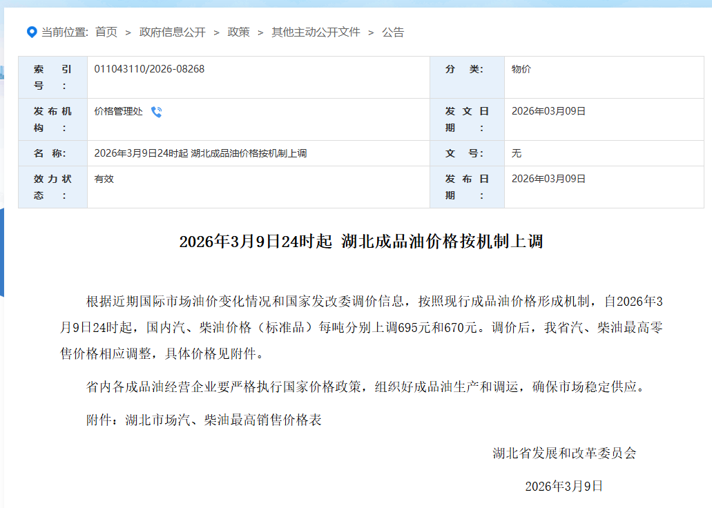 从省发改委价格管理处获悉,自3月9日24时起,省内92号、95号汽油、0号柴油每升分别上调0.56元、0.59元、0.58元。