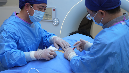 手术当天,在CT精准引导下,阮剑辉与田学愎将纤细的射频针精准穿刺至病灶处,通过深部神经调控,精准灭活引发疼痛的神经末梢,消除局部炎性刺激。手术用时不到1小时,全程无明显出血,创伤极小。