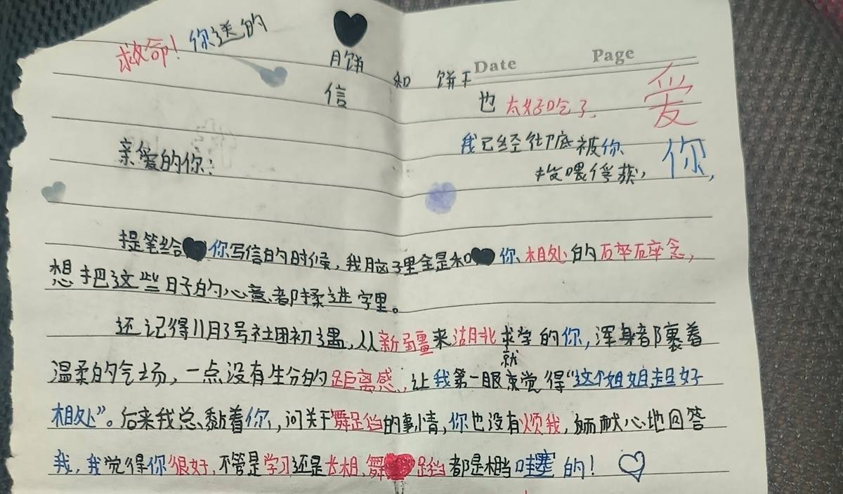 孩子们舍不得这位从天山来的老师,纷纷送来精心准备的小礼物:一枚发卡、一个彩色发圈、几颗仔细包裹的糖果,还有一封封字迹稚嫩的手写信。信里,孩子们写下最纯粹的心意:“提笔给你写信的时候,我脑子里全是你,想把这些日子的心意都揉进字里”“你总顾不上吃饭就扎进教室扣节拍、做示范,累得站不住也不肯歇,真的让我好心疼”“初见时你浑身裹着温柔的气场,一点没有生分的距离感,我觉得这个姐姐超好相处”。