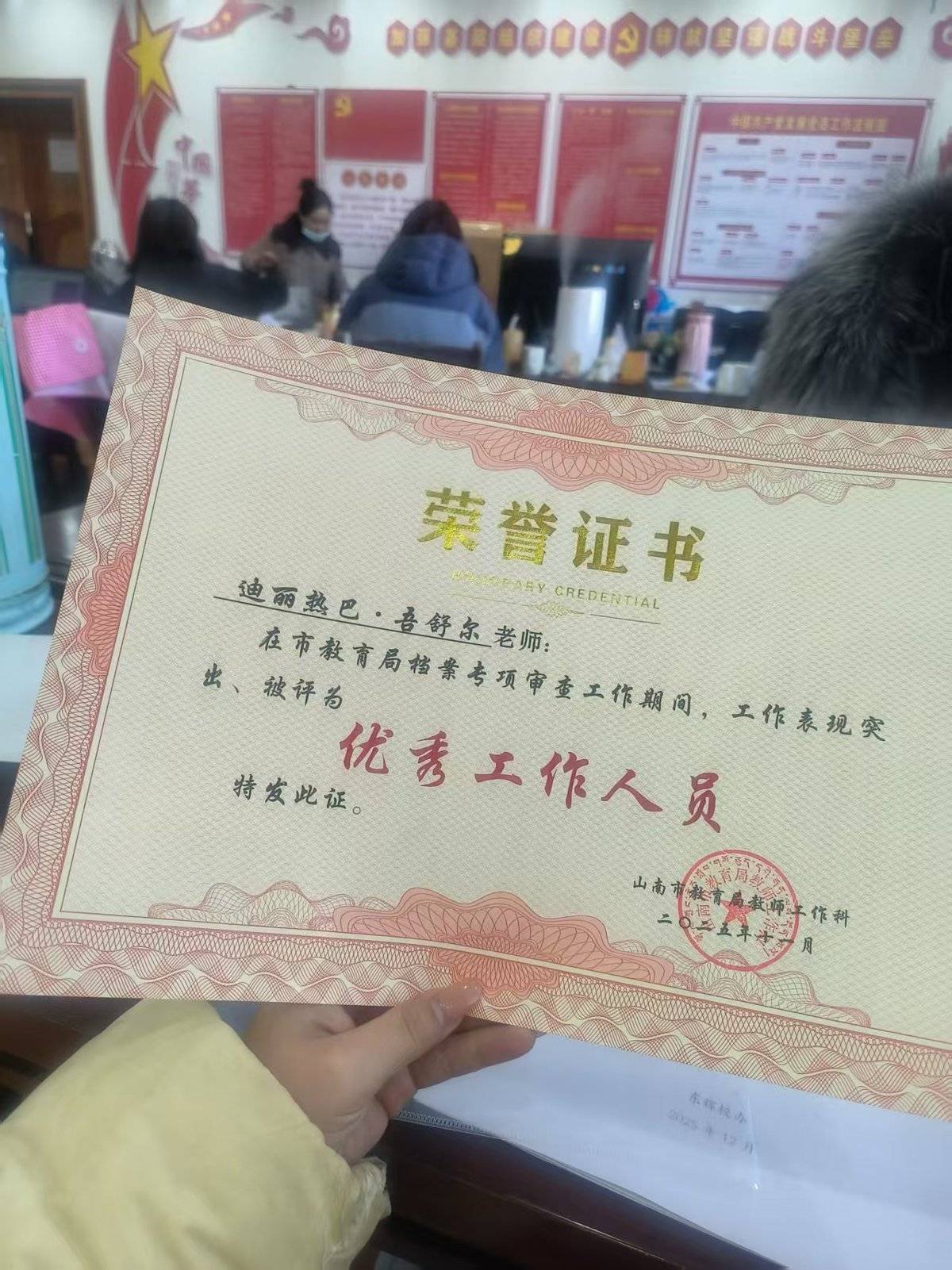 在东辉中学,迪丽热巴除了担任民族舞社团的舞蹈老师外,还认真地完成了校办的各项工作。她参与山南市教育局组织的教师人事档案专项审核工作,三个多月里,和同事们逐页审核学校近三十年93名在职、41名退休教师的档案,查漏补缺、多次补充材料,用严谨细致的工作态度赢得认可,先后获评市教育局“优秀工作者”“优秀工作人员”,以及学校“优秀行政人员”,支教期满考核更是获评优秀。
