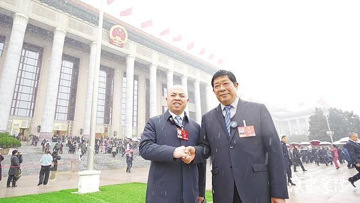 ▲2026年全国两会期间,全国人大代表闵洪艳(右)、汪玉成在人民大会堂前合影。