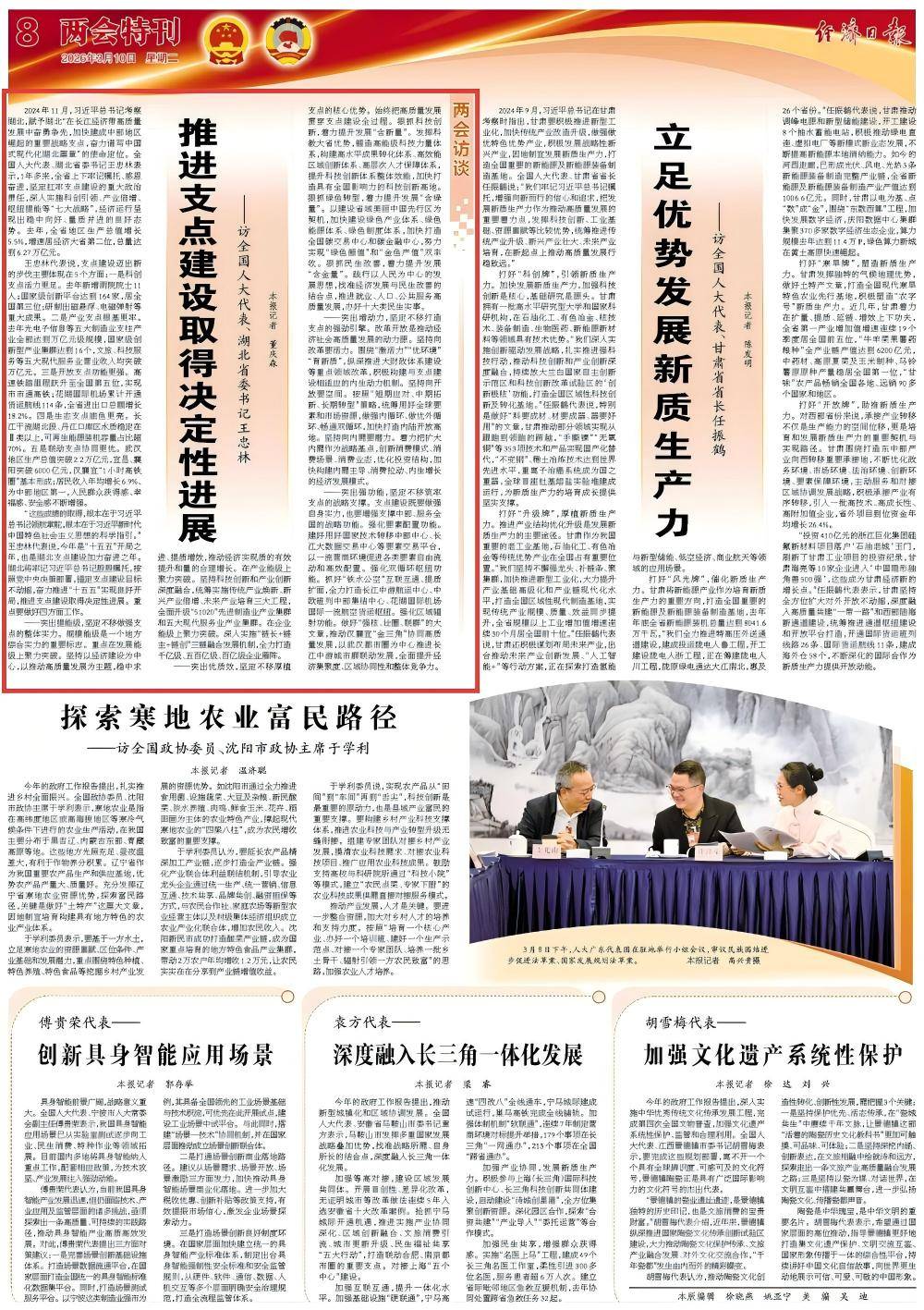 2024年11月,习近平总书记考察湖北,赋予湖北“在长江经济带高质量发展中奋勇争先,加快建成中部地区崛起的重要战略支点,奋力谱写中国式现代化湖北篇章”的使命定位。全国人大代表、湖北省委书记王忠林表示,1年多来,全省上下牢记嘱托、感恩奋进,坚定扛牢支点建设的重大政治责任,深入实施科创引领、产业倍增、枢纽提能等“七大战略”,经济运行呈现出稳中向好、量质并进的良好态势。去年,全省地区生产总值增长5.5%,增速居经济大省第二位,总量达到6.27万亿元。