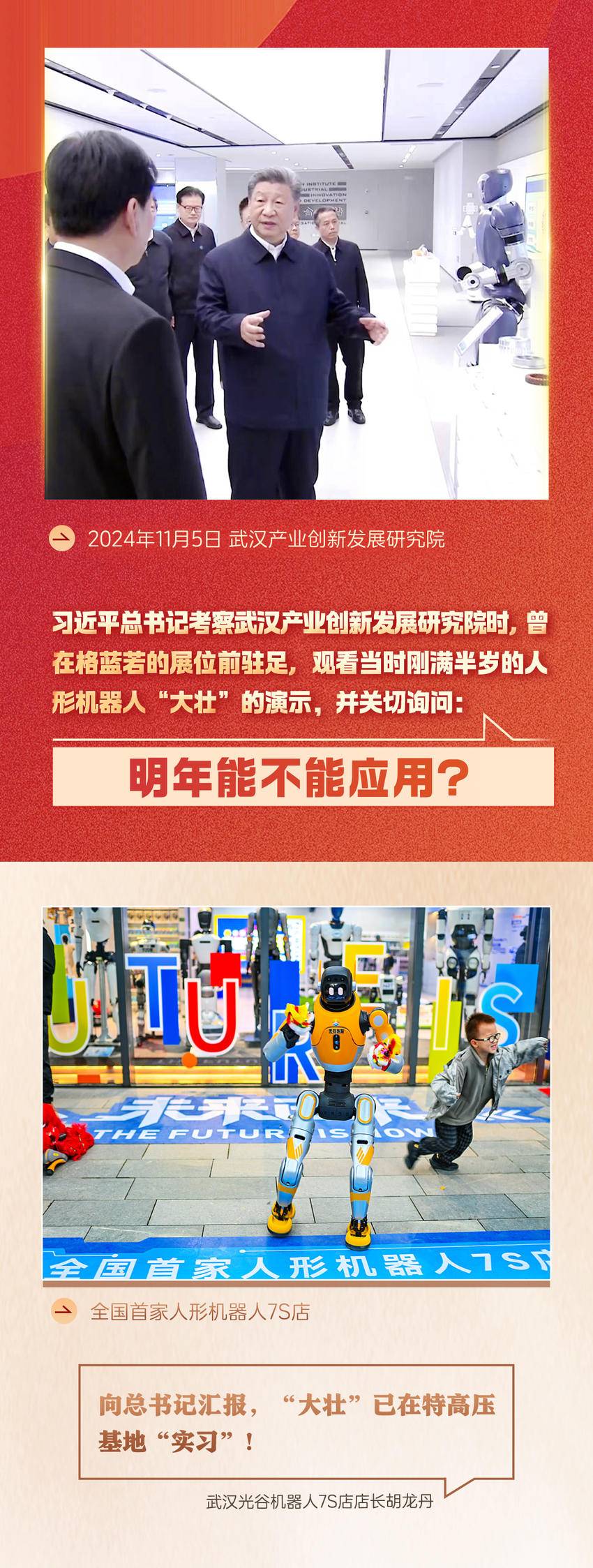 2024年11月5日,习近平总书记考察武汉产业创新发展研究院时,曾在格蓝若的展位前驻足,观看当时刚满半岁的人形机器人“大壮”的演示,并关切询问:“明年能不能应用?”