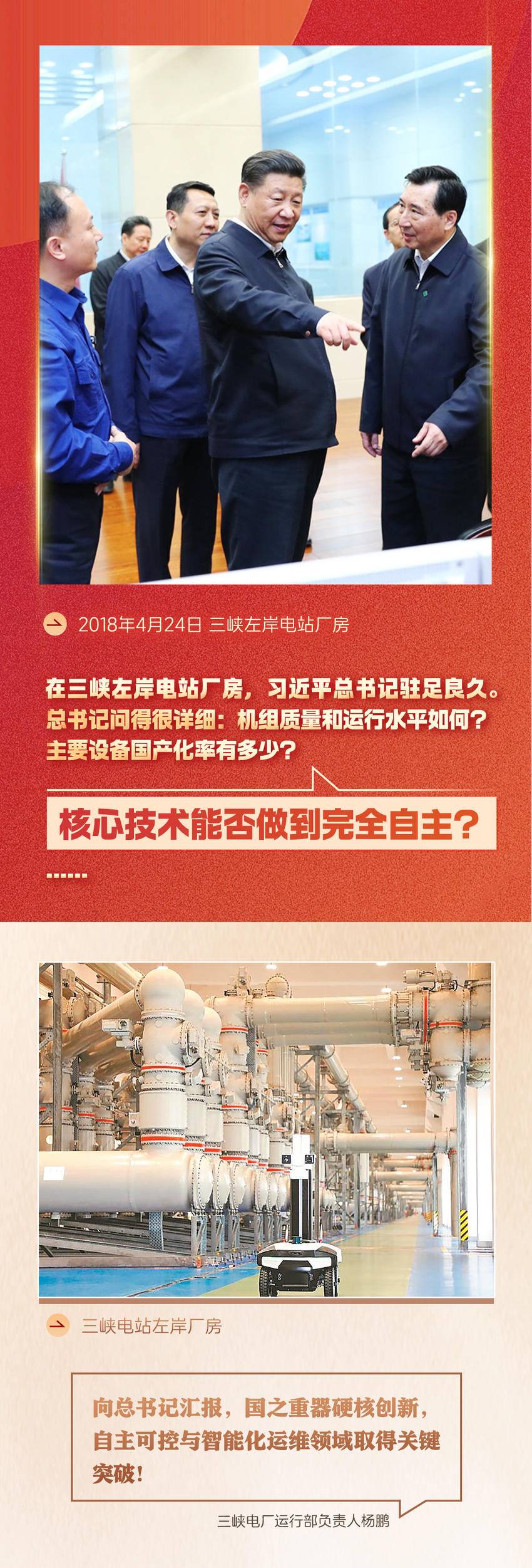 2018年4月24日下午5时许,在三峡左岸电站厂房,习近平总书记驻足良久。“机组质量和运行水平如何?”“主要设备国产化率有多少?”“核心技术能否做到完全自主?”……他问得很详细。