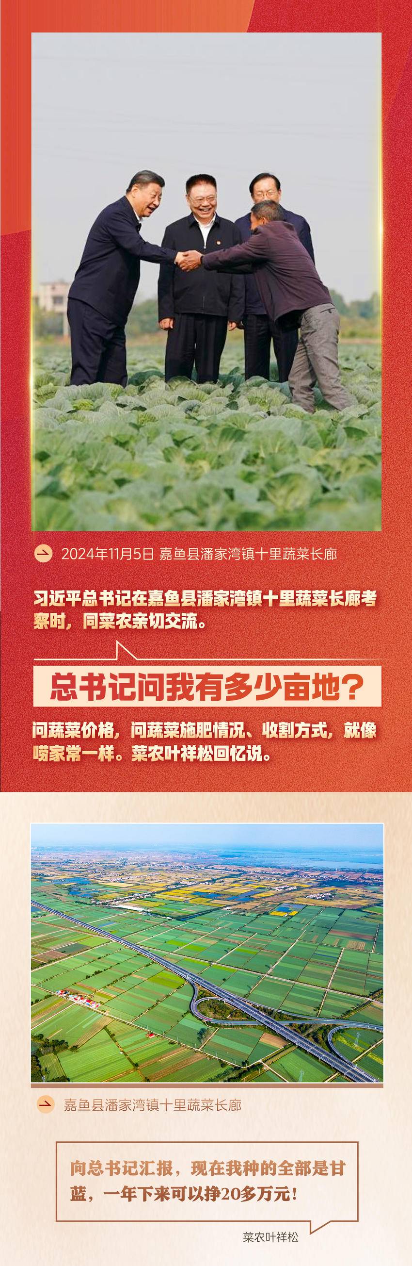 2024年11月5日,在潘家湾十里蔬菜长廊,习近平总书记一边了解农民收成,一边叮嘱当地“把蔬菜种植这个富民产业进一步做好”。
