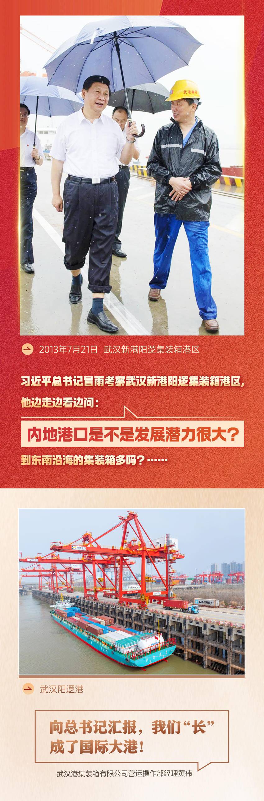 阳逻港,是习近平总书记在党的十八大后考察的第一个内河港口。2013年7月21日,习近平总书记来到武汉新港阳逻集装箱港区考察调研。冒着瓢泼大雨,总书记卷起裤腿,打着雨伞,蹚着积水,边走边看边问:“内地港口是不是发展潜力很大?到东南沿海的集装箱多吗?”