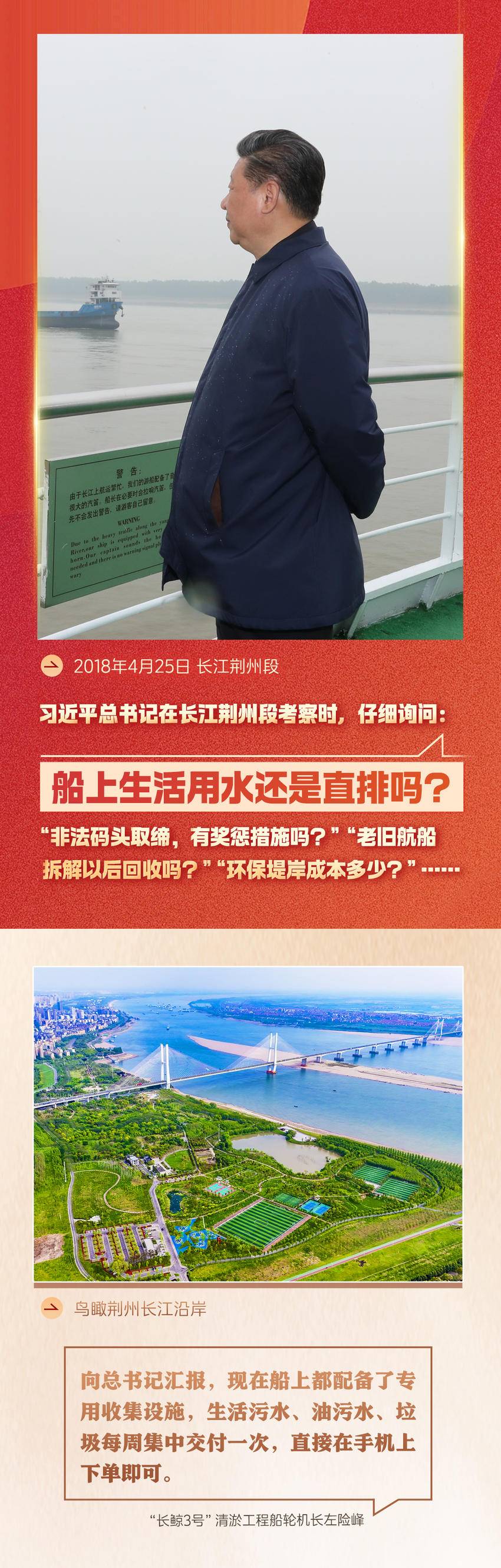 2018年4月25日,习近平总书记在长江荆州段考察时,仔细询问:“船上生活用水还是直排吗?”“非法码头取缔,有奖惩措施吗?”“老旧航船拆解以后回收吗?”“环保堤岸成本多少?”……
