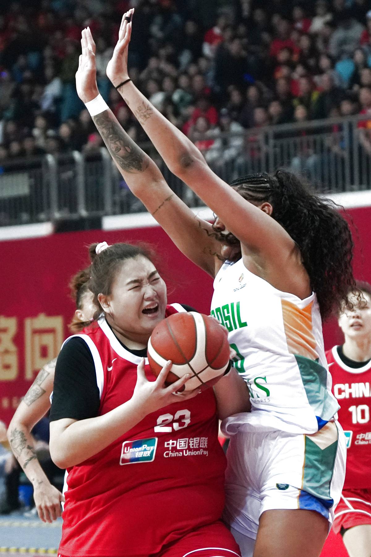 3月6日,在长沙的2026年中国女篮热身赛中,中国队球员刘禹彤(左)在巴西队球员卡米拉防守下进攻。(新华社发)