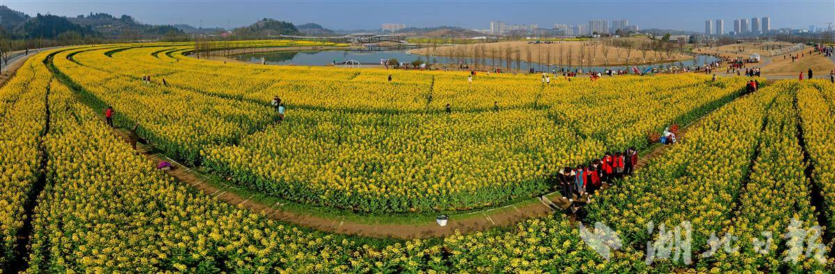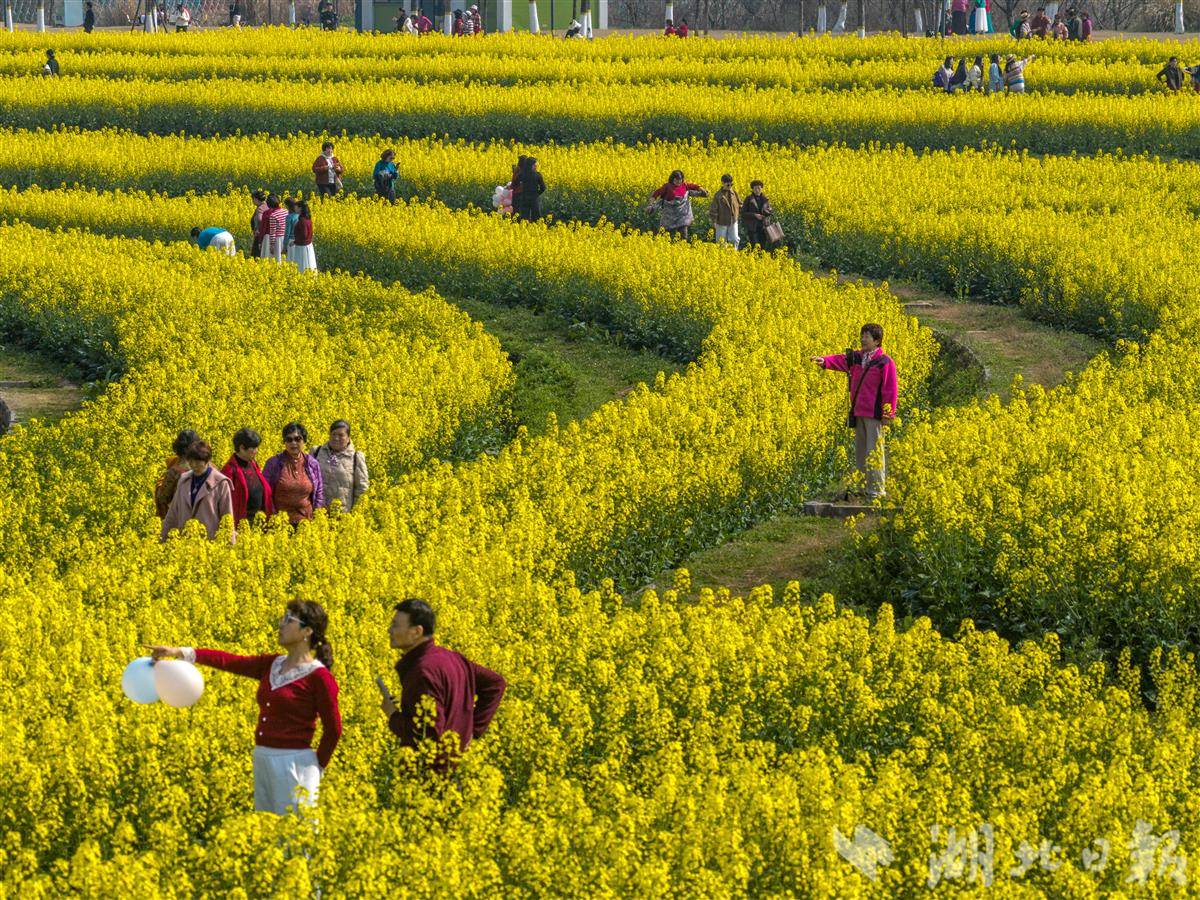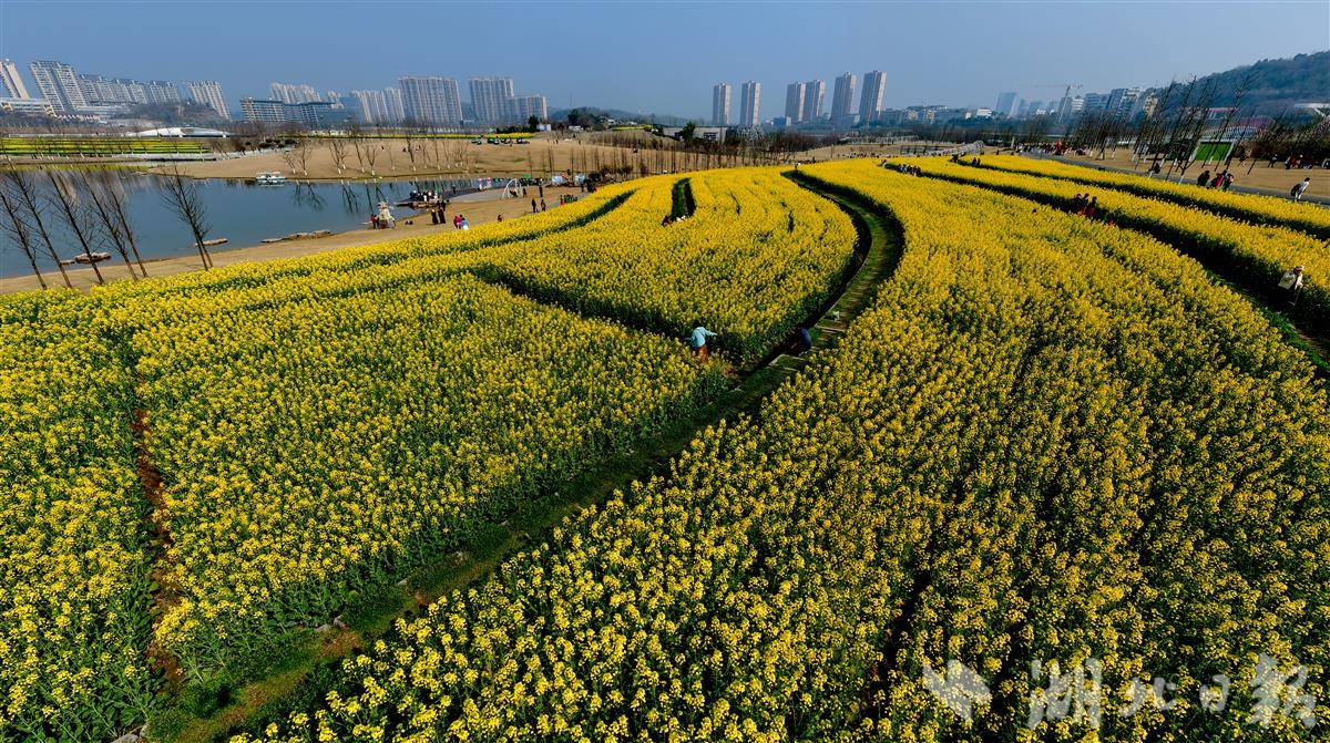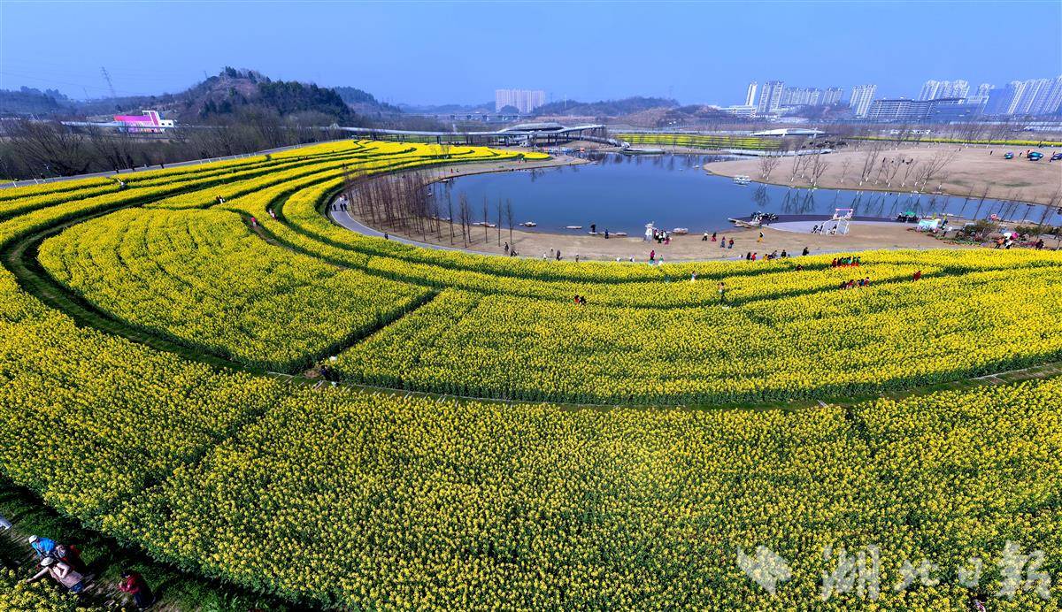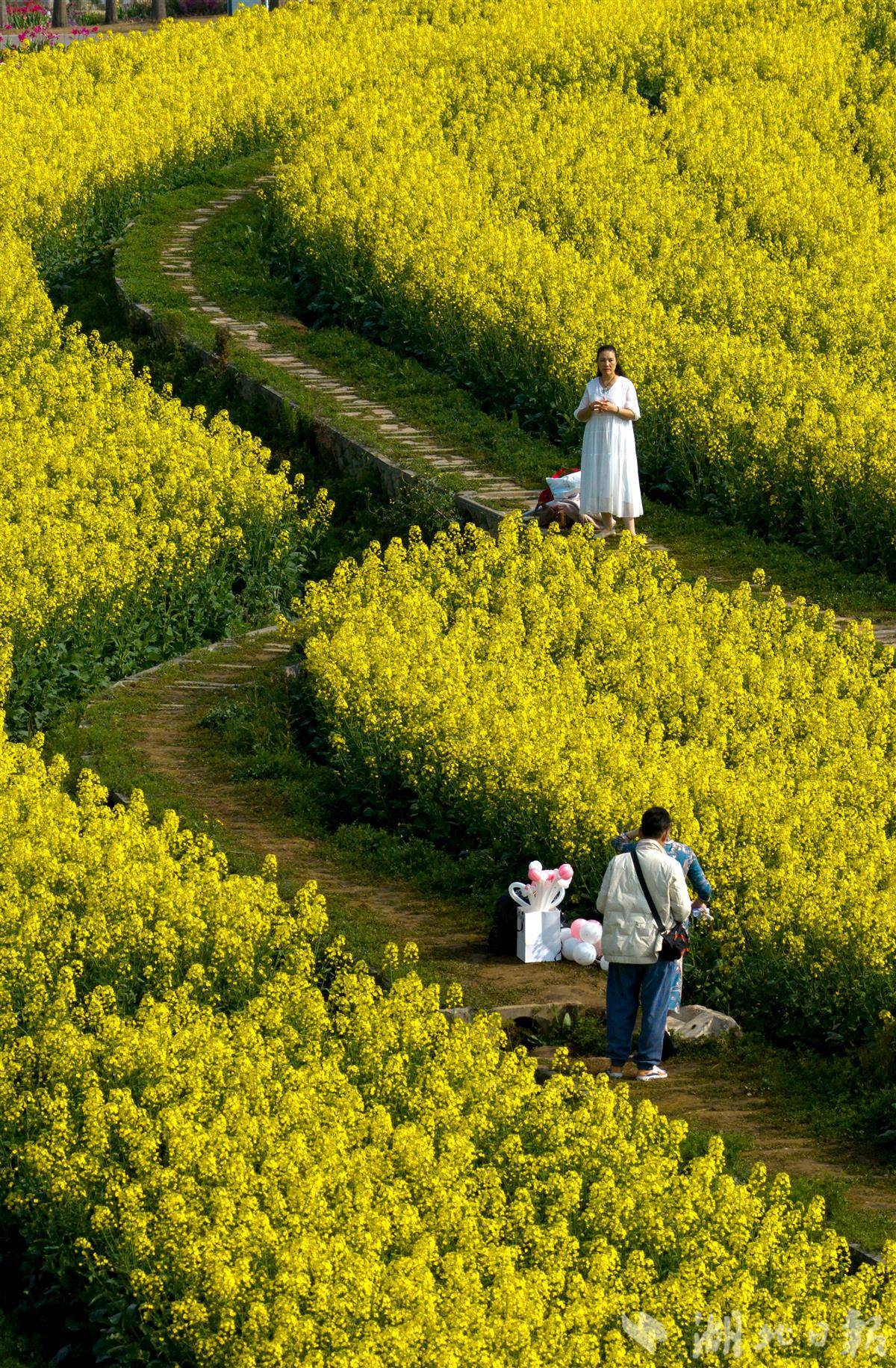 春日暖阳下,连片的油菜花随风摇曳、叠翠流金,与公园内的河道、绿植构成一幅灵动的春日画卷,游人漫步花间,轻嗅花香,感受着都市里的田园意趣。(湖北日报全媒记者 刘曙松 摄)
