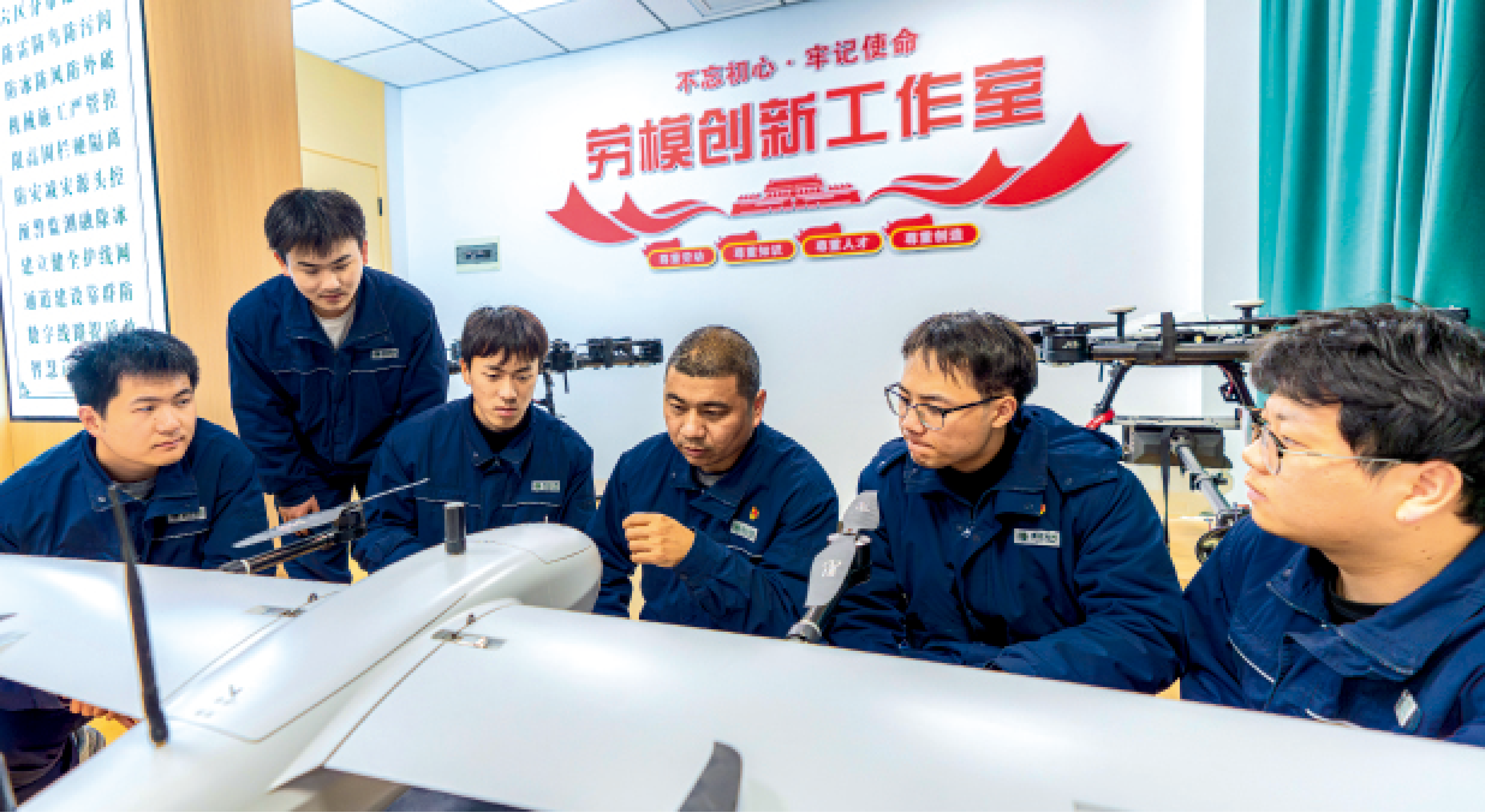 艾虎在劳模创新工作室为青年员工讲解无人机巡检技术要点