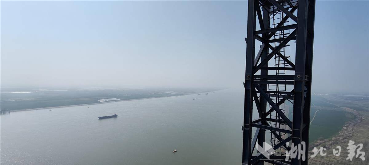 从大桥北主塔作业平台俯瞰,长江波澜不惊。湖北日报全媒记者 汪洋 摄