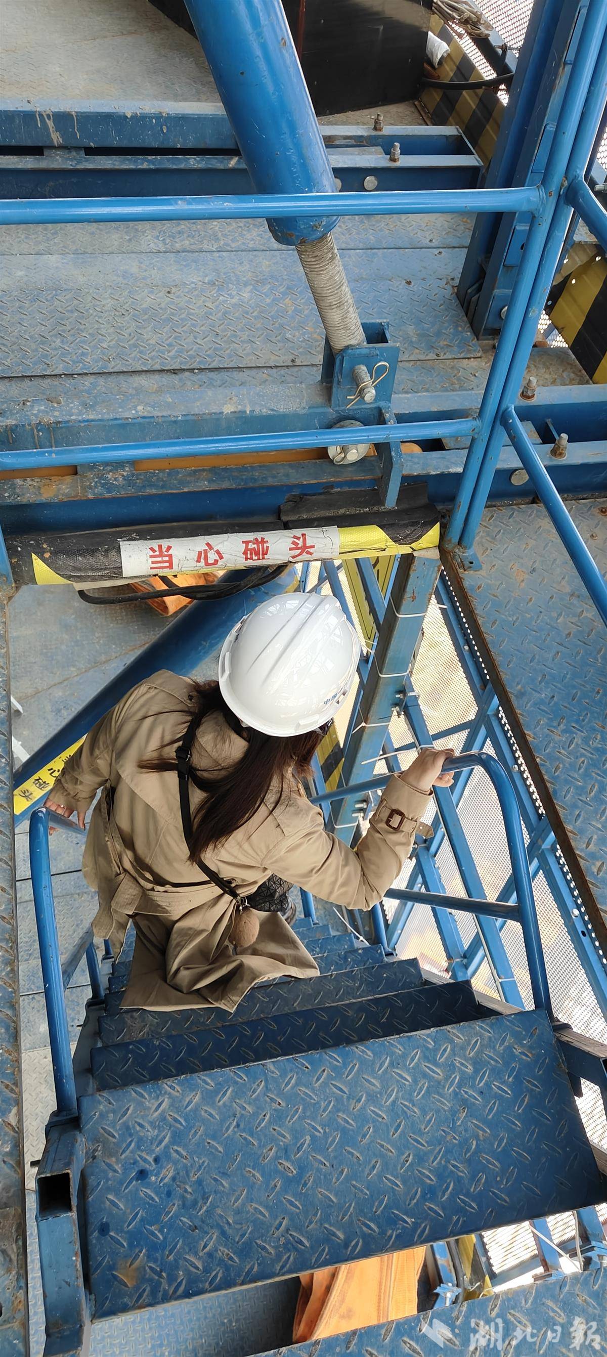 湖北日报全媒记者杨文漪攀爬近乎垂直的施工步梯。湖北日报全媒记者 汪洋 摄