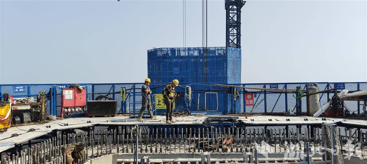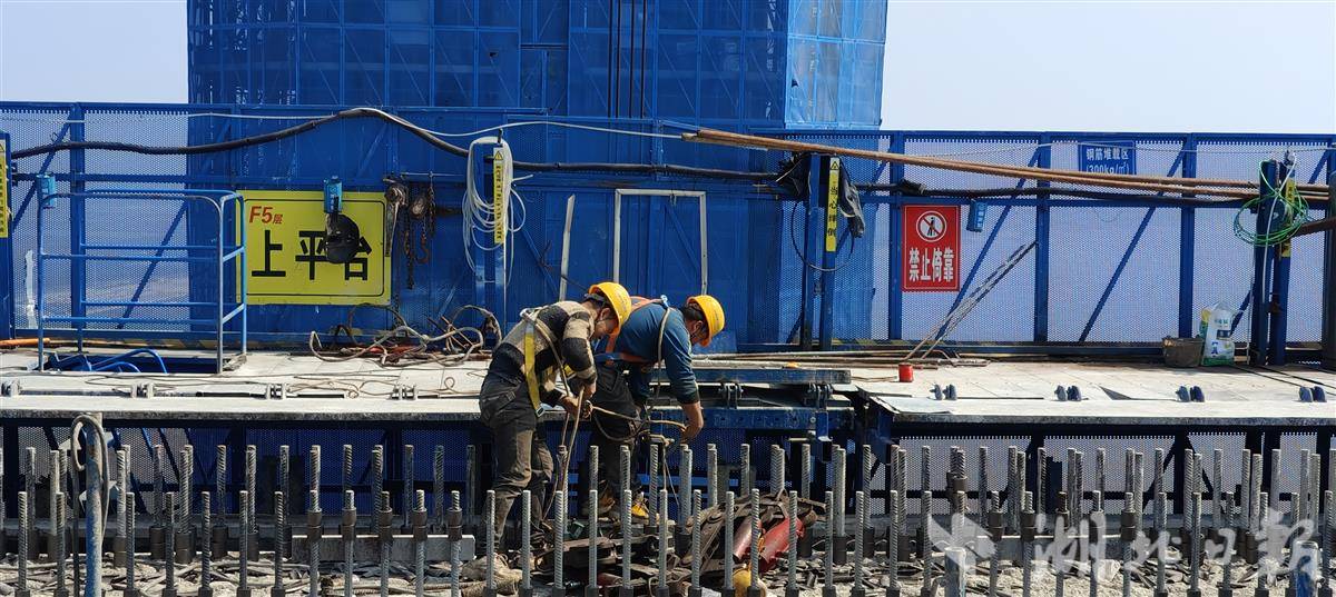 此时,来自贵州遵义的两名建筑工人——35岁的张建成和27岁的刘园,身上系着安全绳,正在平台上作业,“主塔浇筑完成第30节,即将开始浇筑第31节。”