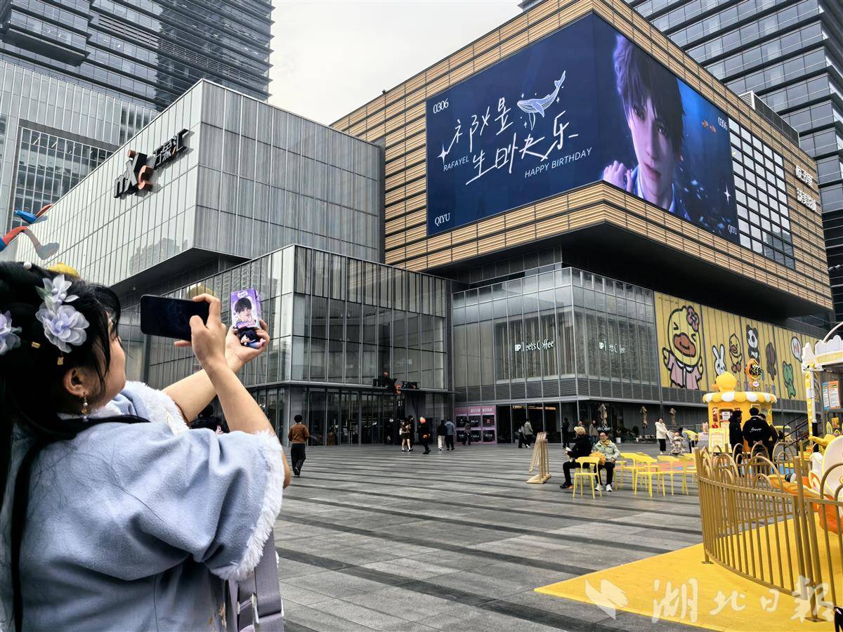 3月6日,武汉亲橙万象汇,粉丝在商场外和角色电子大屏合影。湖北日报全媒记者王艳华 摄