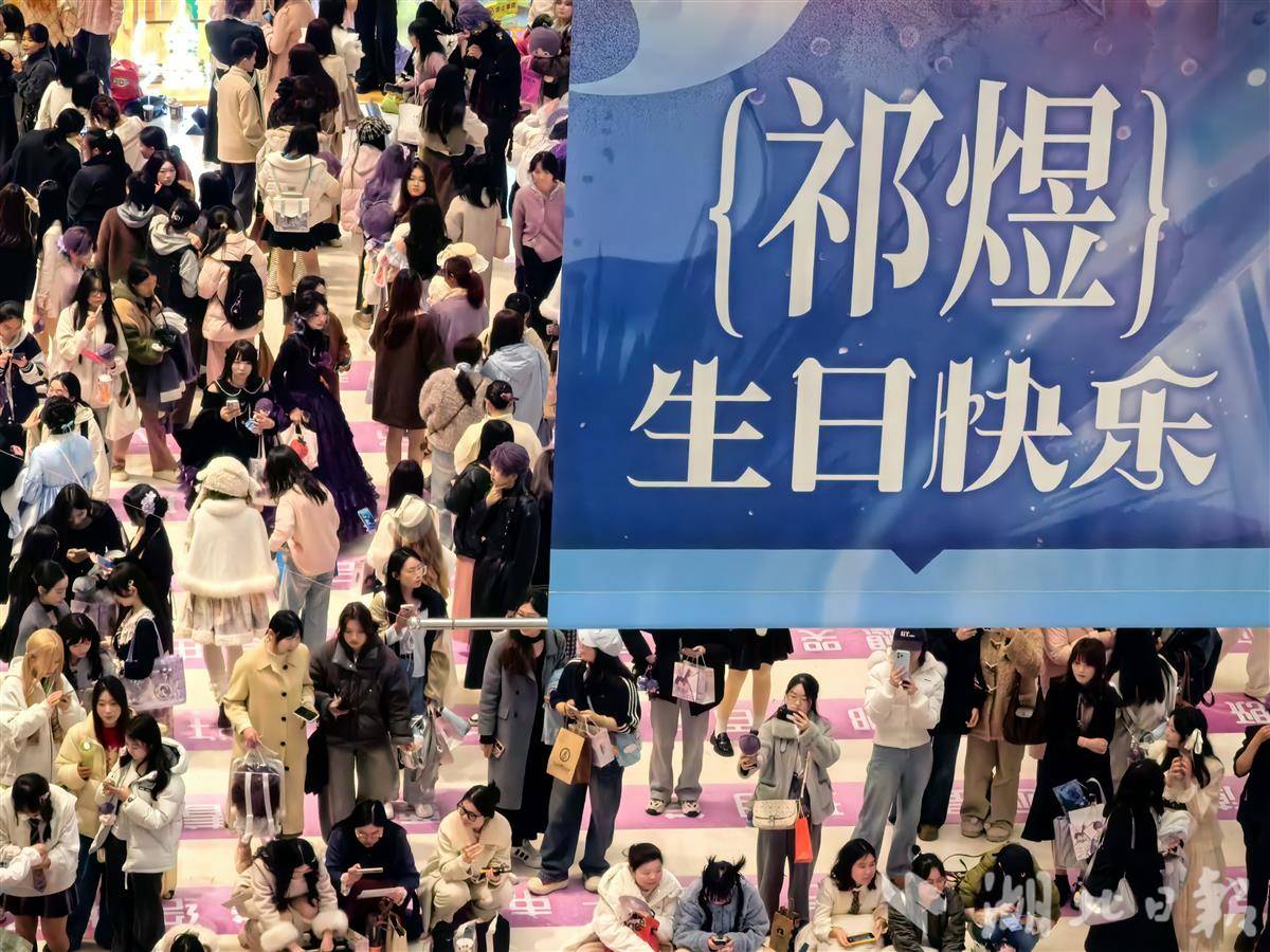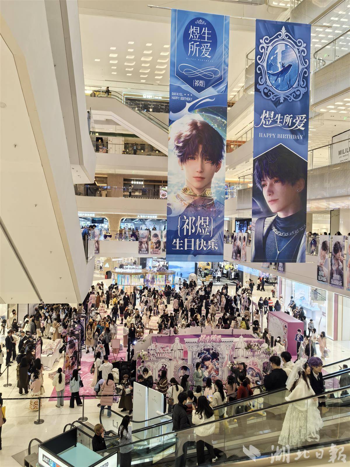 站在商场中庭,两张巨幅海报从四楼垂下,上面是同一个动漫人物的脸,分别印着“祁煜 生日快乐”和“煜生所爱”。商场中庭还设置了花墙、人物海报、人形立牌、地贴,三楼的电子屏滚动播放角色生日快乐,数百人在中庭互动、拍摄、合影,热闹非凡,就像明星见面会现场。