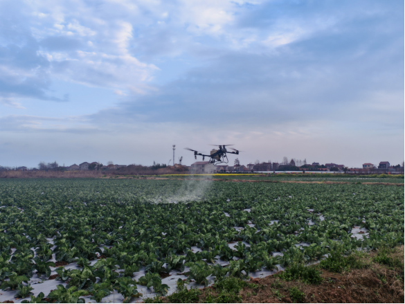 在李埠镇埠龙江合作社的蔬菜种植基地,植保无人机正在低空来回穿梭作业,均匀喷洒农药和肥料,为正值生长期的蔬菜提供精准管护。据悉,单台无人机每天可完成200余亩的喷洒作业,作业效率是人工的二三十倍,有效保障了蔬菜病虫害防治和追肥的及时性。