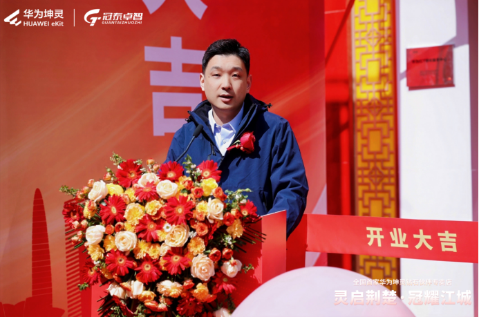 武汉冠泰卓智科技有限公司总经理龚威发表致辞,他表示,华为坤灵钻石伙伴专卖店是华为分销业务的突破性尝试,也是服务中小企业智能化跃升的全新商业模式。作为湖北钻石分销商,公司将以专卖店为作战阵地,落地营、销、服一体化市场策略,全方位助力湖北集成商、工程商发展。未来 2 年,公司计划将华为坤灵钻石伙伴专卖店拓展至湖北各个地级市,在地市打造作战阵地、发展同路人,助力合作伙伴提升营收规模与服务能力,打通中小企业通往数智化世界的最后一公里。