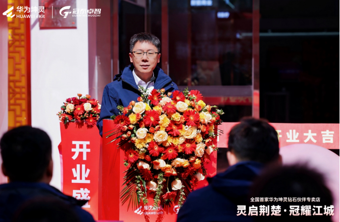 开业现场,华为中国政企分销销售部部长王猛做开场致辞,他表示,2025年10月,华为在全国10个试点城市启动首批10家钻石分销商伙伴授牌,武汉冠泰卓智科技有限公司成为湖北首个获牌企业,也是华为推动一站式场景方案落地武汉的核心伙伴。今天全国首家华为坤灵钻石伙伴专卖店落地武汉,并由华为联合冠泰卓智共同建设和运营,这将是华为携手核心伙伴深耕华中市场、赋能中小企业智能化跃升的全新起点。希望通过与分销钻石伙伴的紧密合作,未来3年发展一万家精英工程商,共同打造覆盖全国的销售和服务网络,让华为的产品和场景方案,能够快速、精准地触达每一个中小企业客户。