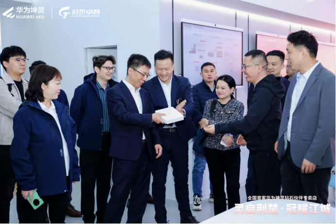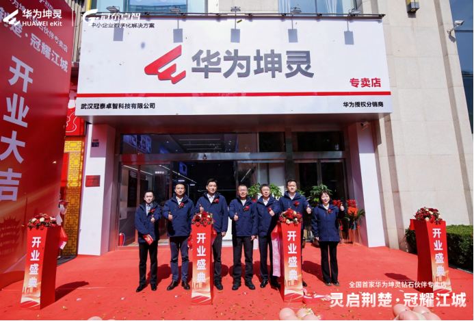 3月10日,全国首家华为坤灵钻石伙伴专卖店在武汉楚河汉街核心商圈正式开业。作为华为携手合作伙伴武汉冠泰卓智科技有限公司(简称“武汉冠泰卓智”)打造的区域品牌地标,该专卖店的开业标志着华为坤灵在华中地区助力中小企业智能化跃升的布局迈入全新阶段。华为中国政企分销销售部部长王猛、华为中国政企业务CMO郁赛华、华为湖北政企业务部总经理冯军伟、武汉冠泰卓智科技有限公司总经理龚威及湖北各地市精英工程商伙伴齐聚现场,共同见证这一重要时刻。