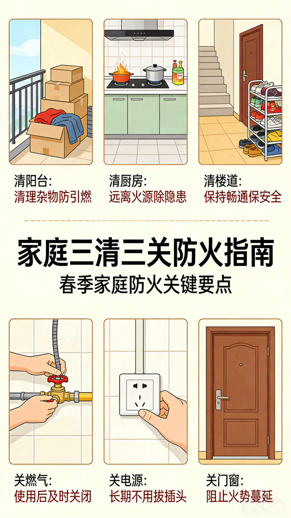 在家中要重点防范用火、用电、用气安全,注意“三清三关”,清厨房:定期清理灶台、油烟机油污,避免油、纸、布等可燃物靠近炉灶;烹饪时不离人,防止油锅过热起火;清阳台:及时清理纸箱、旧衣物、塑料等易燃杂物,不在阳台堆放柴草或违规停放电动自行车;清走道:确保楼梯间、疏散通道、入户门口无杂物堆放,严禁电动自行车停放或充电,保障逃生通道畅通。